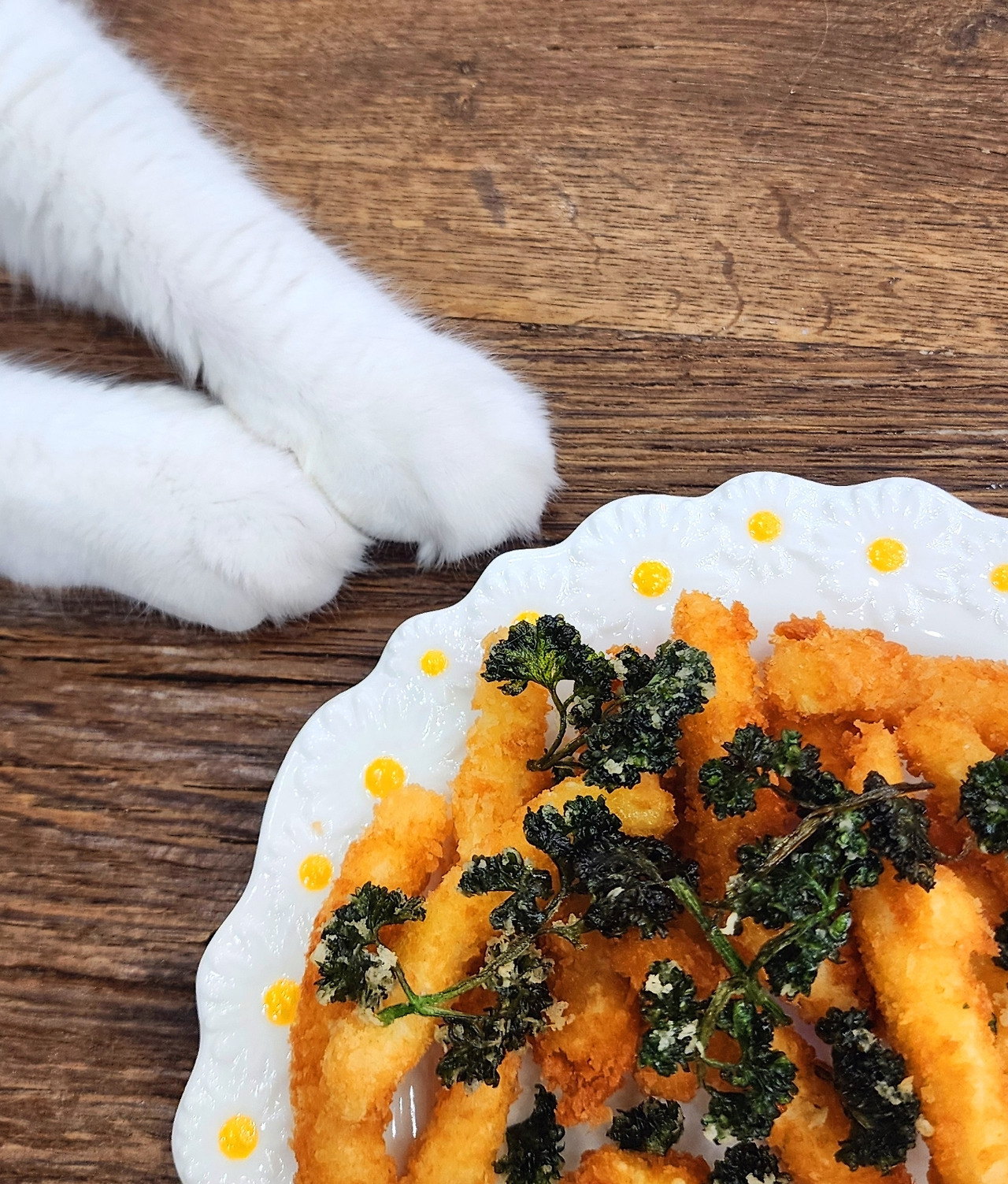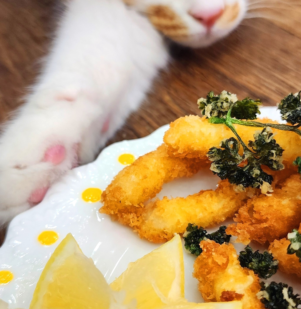 생선인 것을 아는지 고양이가 관심을 갖는다. 호시탐탐 요리를 노린다. 사냥하듯 하얀 발로 콕콕 건드려보고 냄새를 맡는 고양이 너란 녀석.
