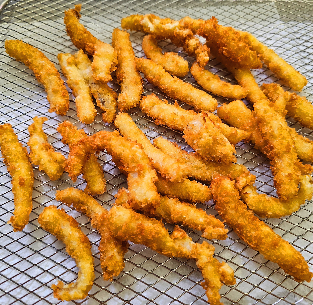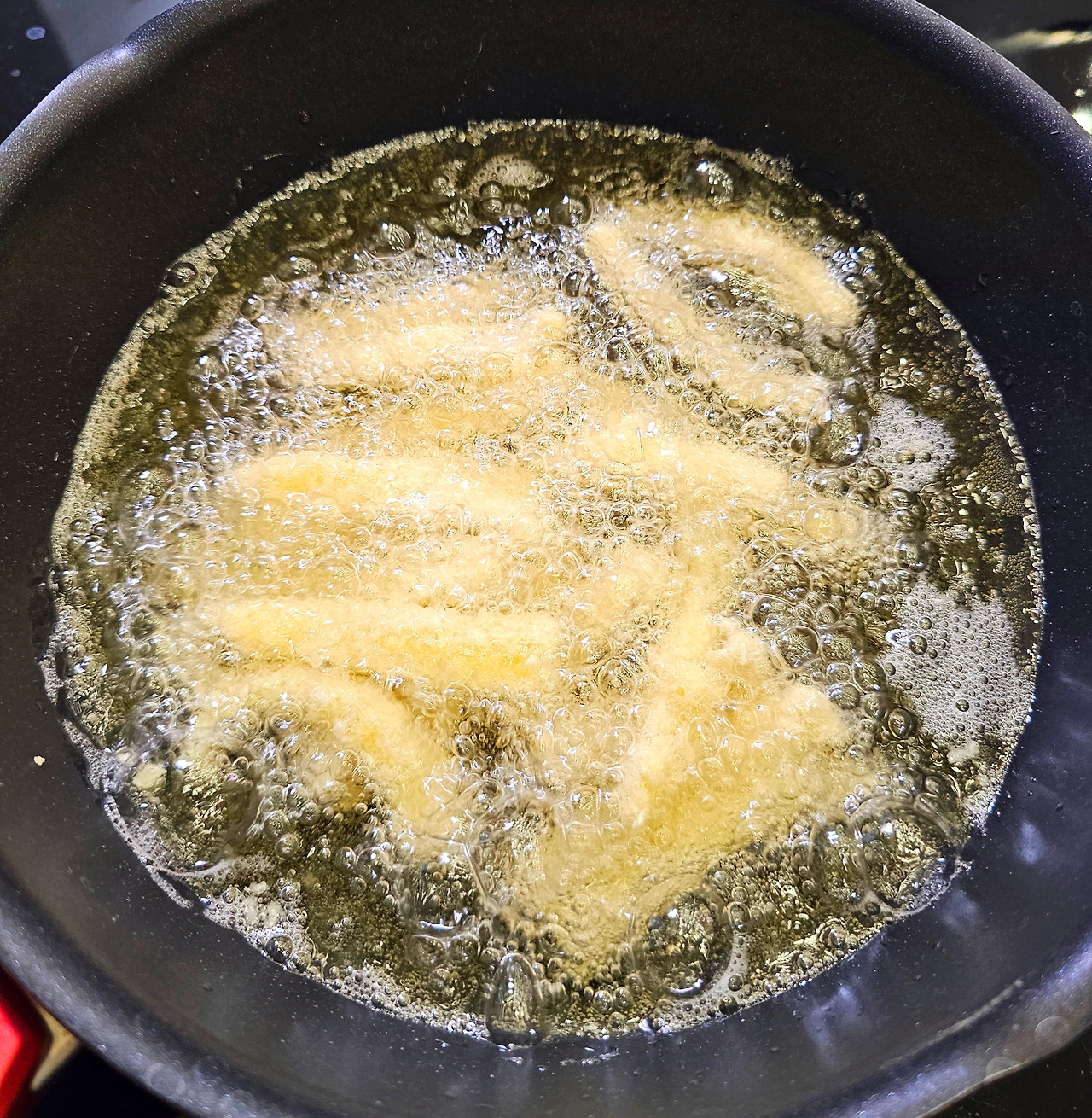이제 식용유에 넣고 먹음직스러운 갈색이 날 때까지 튀겨준다. 튀김을 꺼내고 소금을 뿌려 간을 해주면 튀김 완성이다.