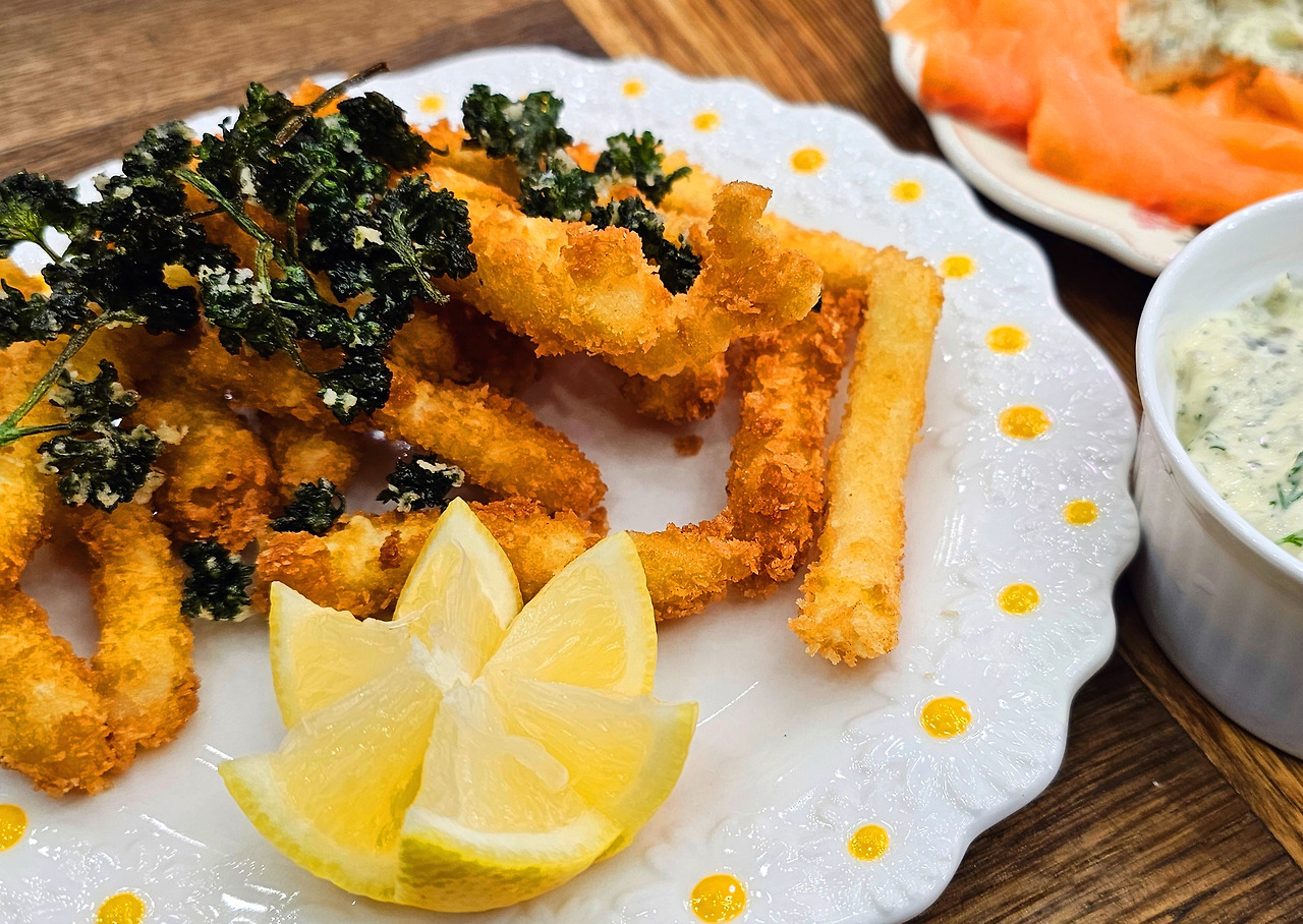 이제 그릇에 튀김을 올리고 레몬과 파슬리로 장식한다. 소스도 그릇에 옮겨 담으면 모든 요리 완성이다.