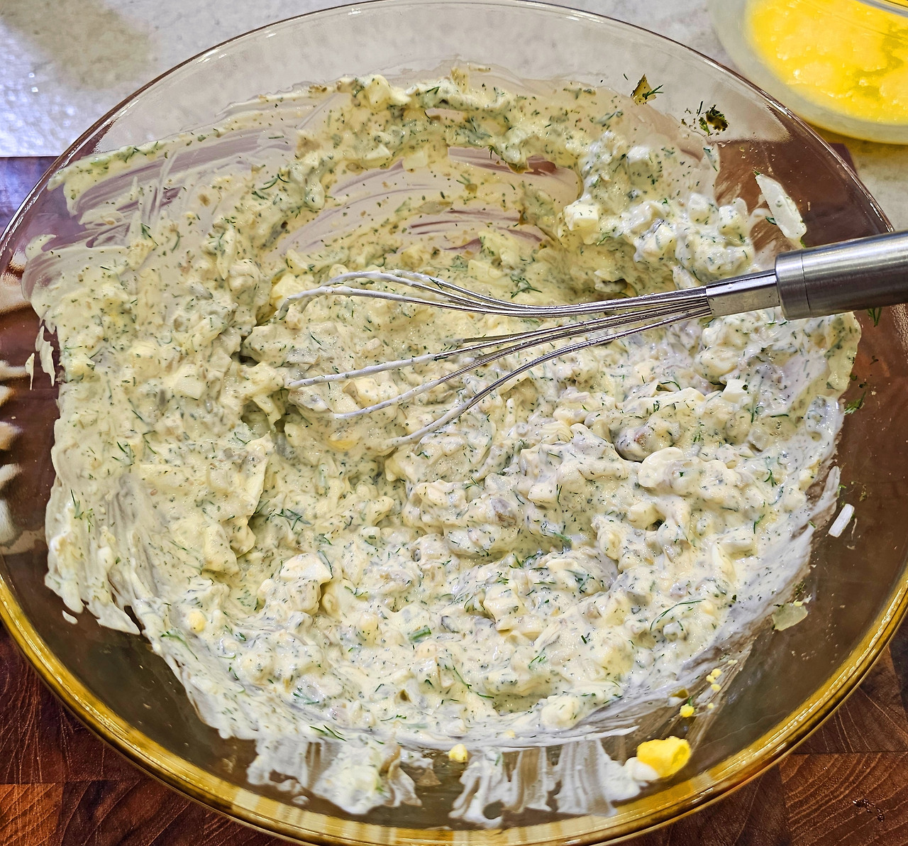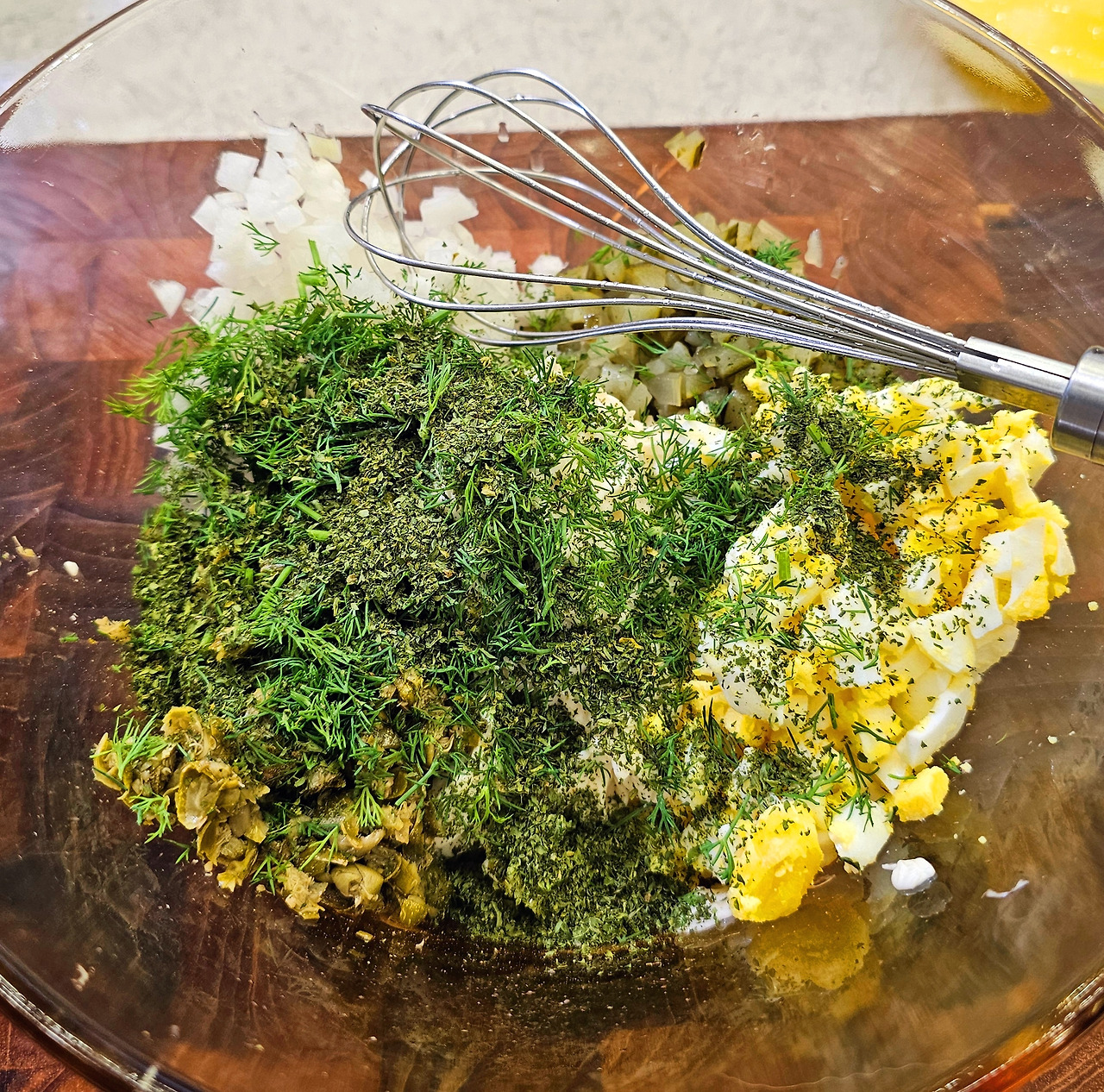 볼에 마요네즈, 다진 케이퍼, 다진 피클, 다진 양파, 다진 딜, 파슬리 가루, 다진 삶은 달걀을 한 번에 넣고 버무려준다. 허브 계열인 딜을 넣었지만 딜이 없다면 향 좋은 다른 허브를 넣어도 된다. 소스 또한 완성되었다.