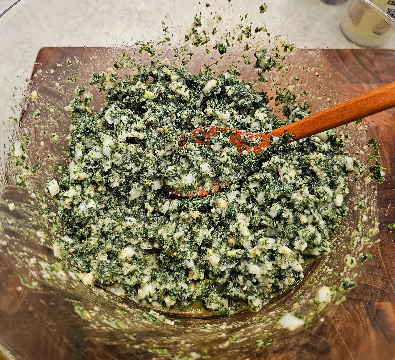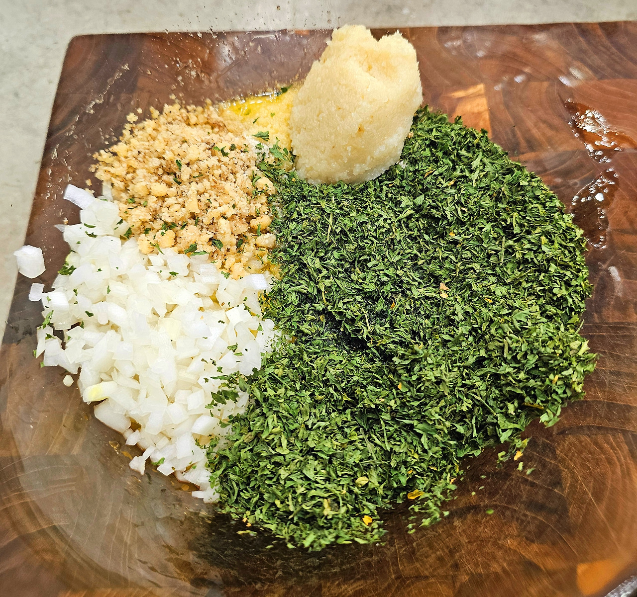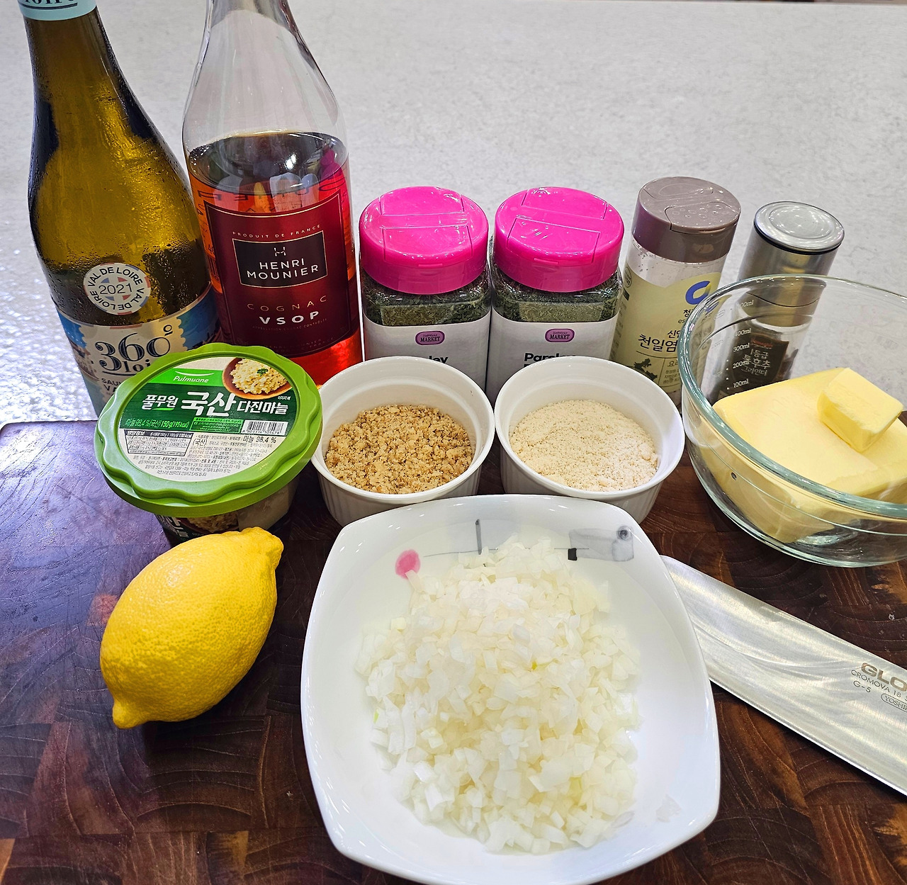 볼에 녹인 버터, 다진 파슬리, 다진 마늘, 다진 양파, 아몬드 가루, 호두 가루를 모두 넣고 잘 섞어준다. 그리고 레몬즙과 코냑을 넣고, 소금과 후춧가루로 간을 해준다. (코냑향이 너무 좋다. 한잔 홀짝~)