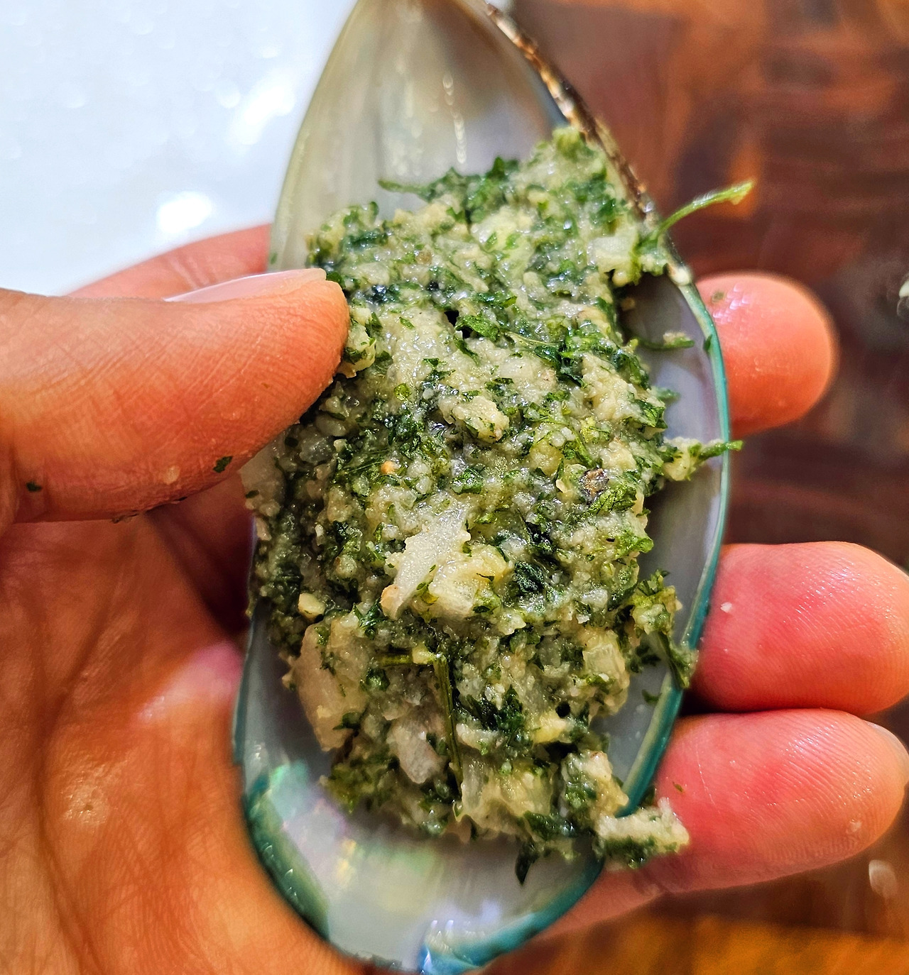홍합이 다 익었으면 홍합살을 떼어 낸다. (환상적인 향이 난다. 옆에서 아들이 맛있는지 홍합살을 계속 집어 먹는다.) 이제 아까 만들어둔 에스카르고 버터를 활용할 시간이 되었다.