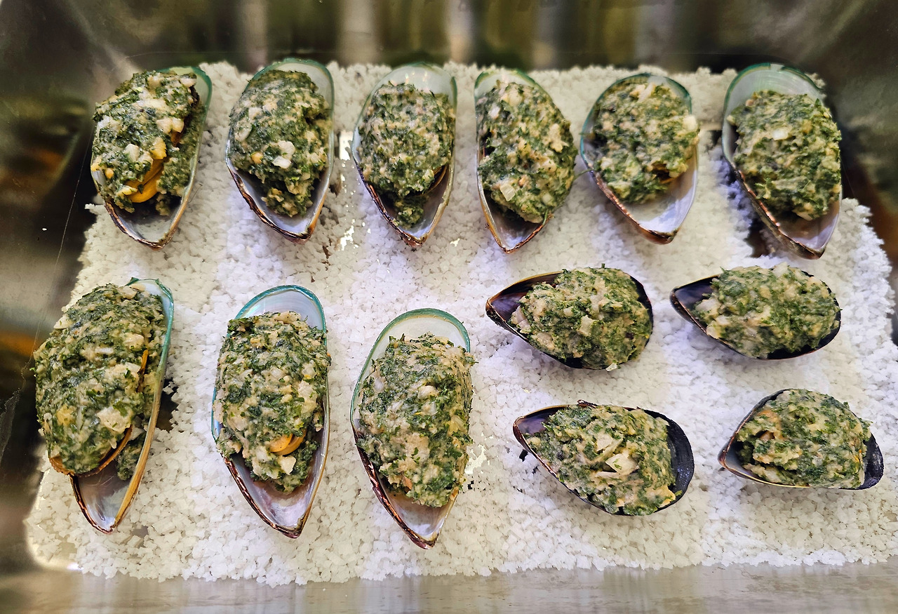 우선 홍합껍데기에 에스카르고 버터를 조금 발라주고 그 위에 홍합살을 얹는다. 홍합살 위로 에스카르고 버터로 덮어 주고 다시 냉장고에 넣어서 굳힌다.