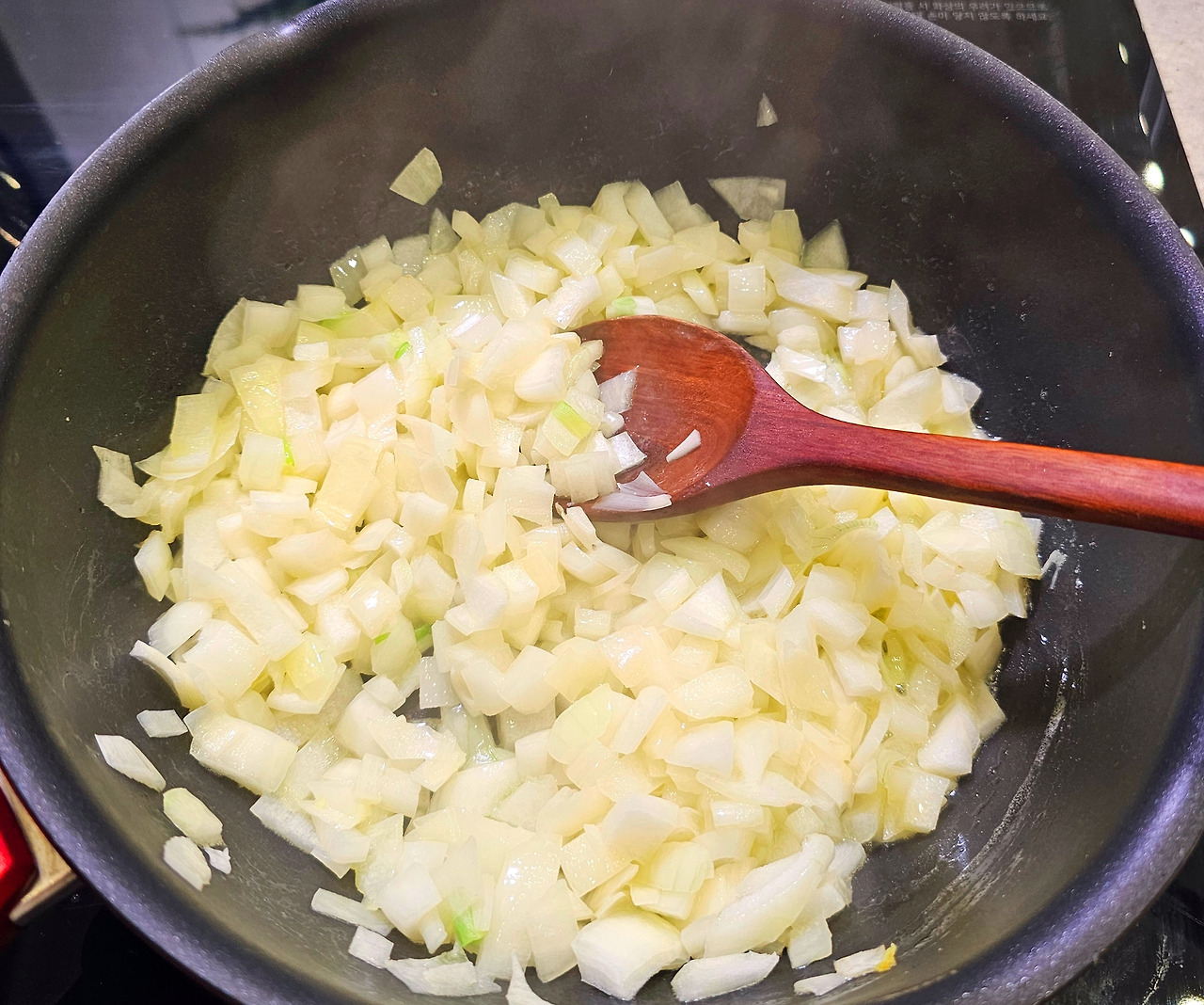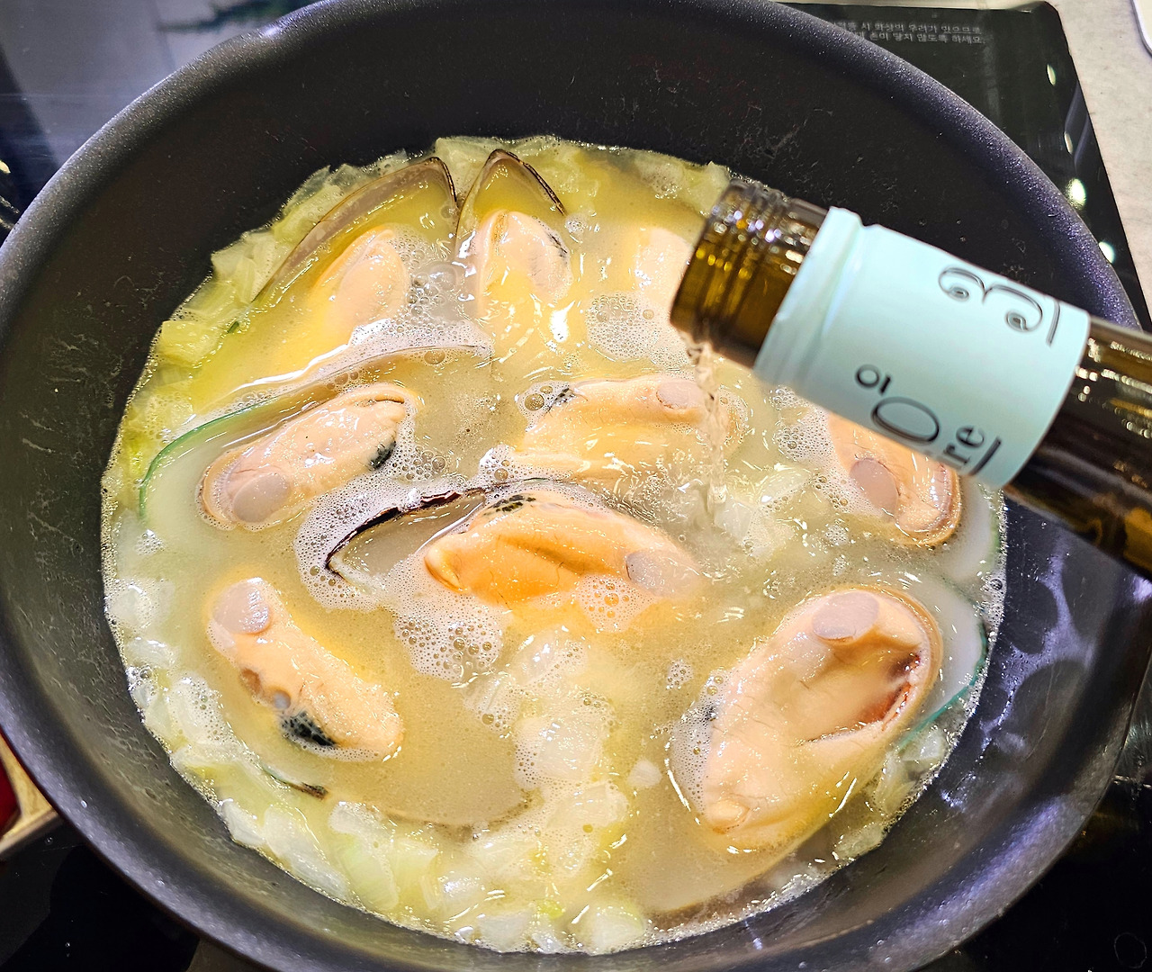 홍합을 익힐 차례다. 냄비에 버터를 녹이고 잘게 썬 양파를 넣고 볶는다. 그리고 홍합을 넣고 화이트 와인을 홍합이 잠길 정도로 부어준다. 뚜껑을 닫고 홍합이 입을 쩍 벌릴 때까지 익힌다.