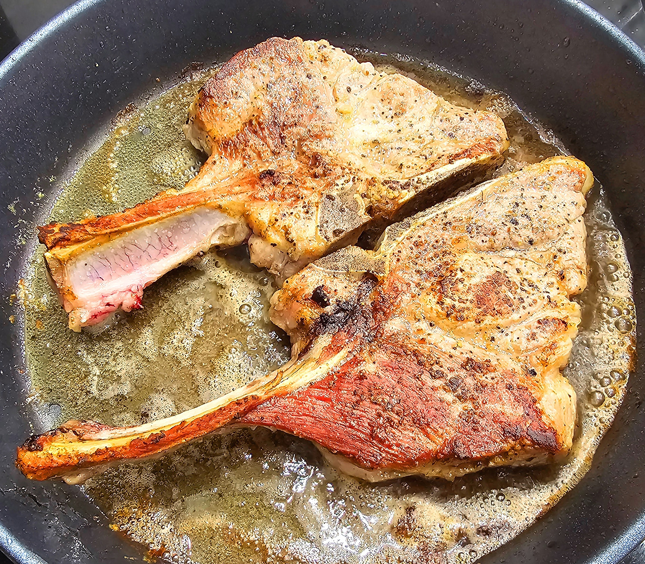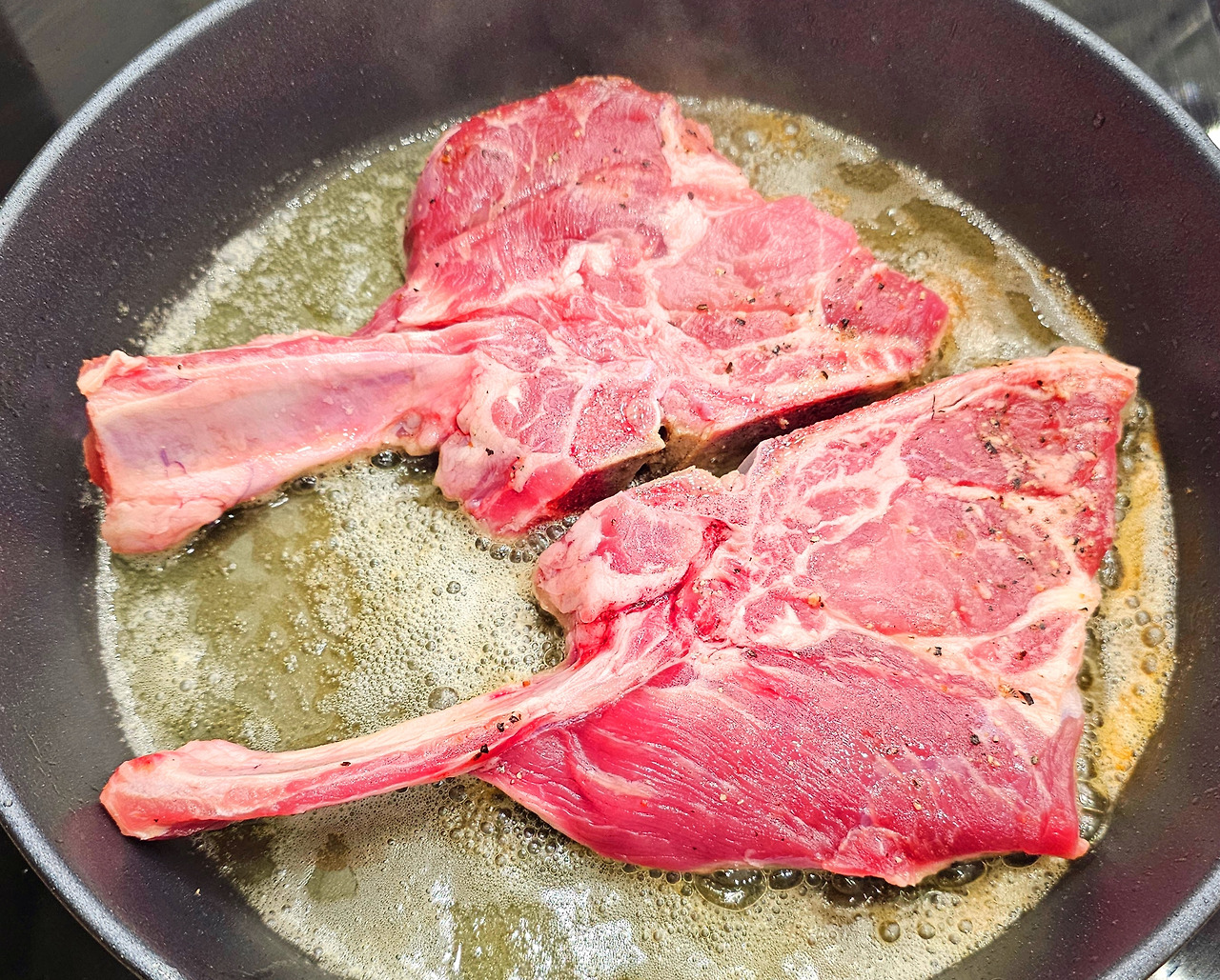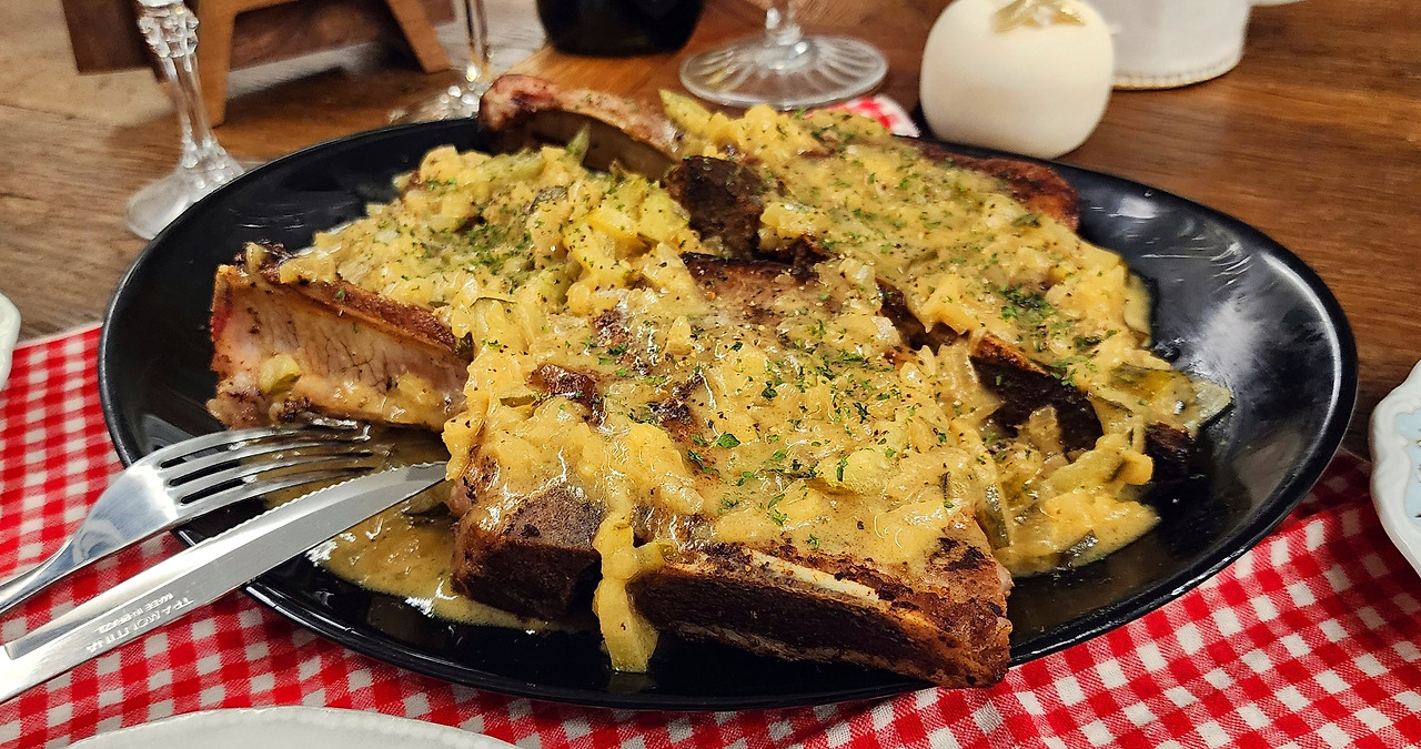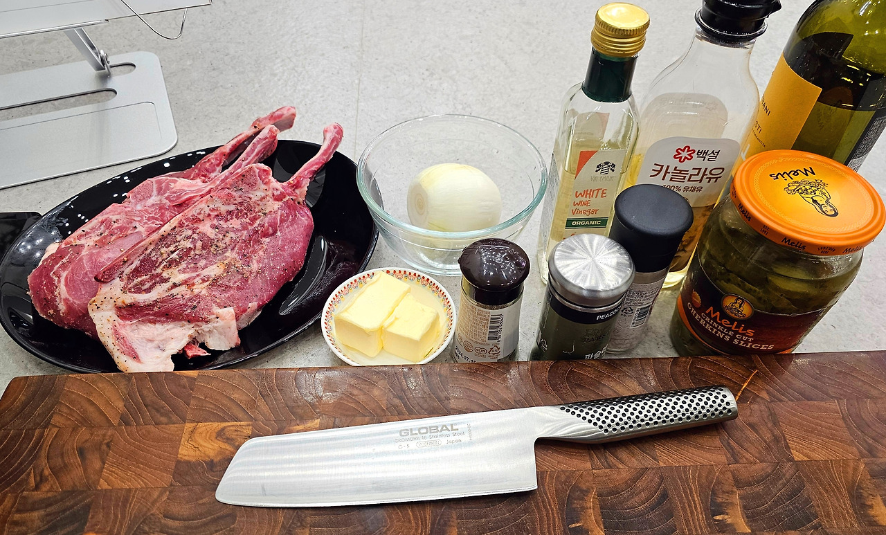 돼지갈비 부위(돈마호크), 버터, 양파, 화이트 와인, 화이트 와인 비니거, 쇠고기 육수, 디종 머스터드