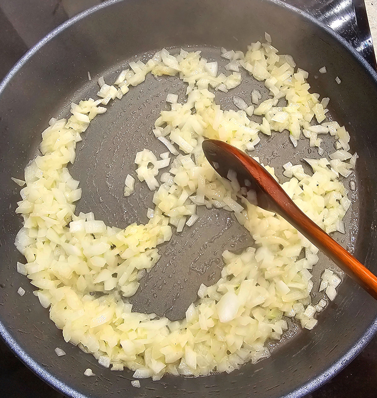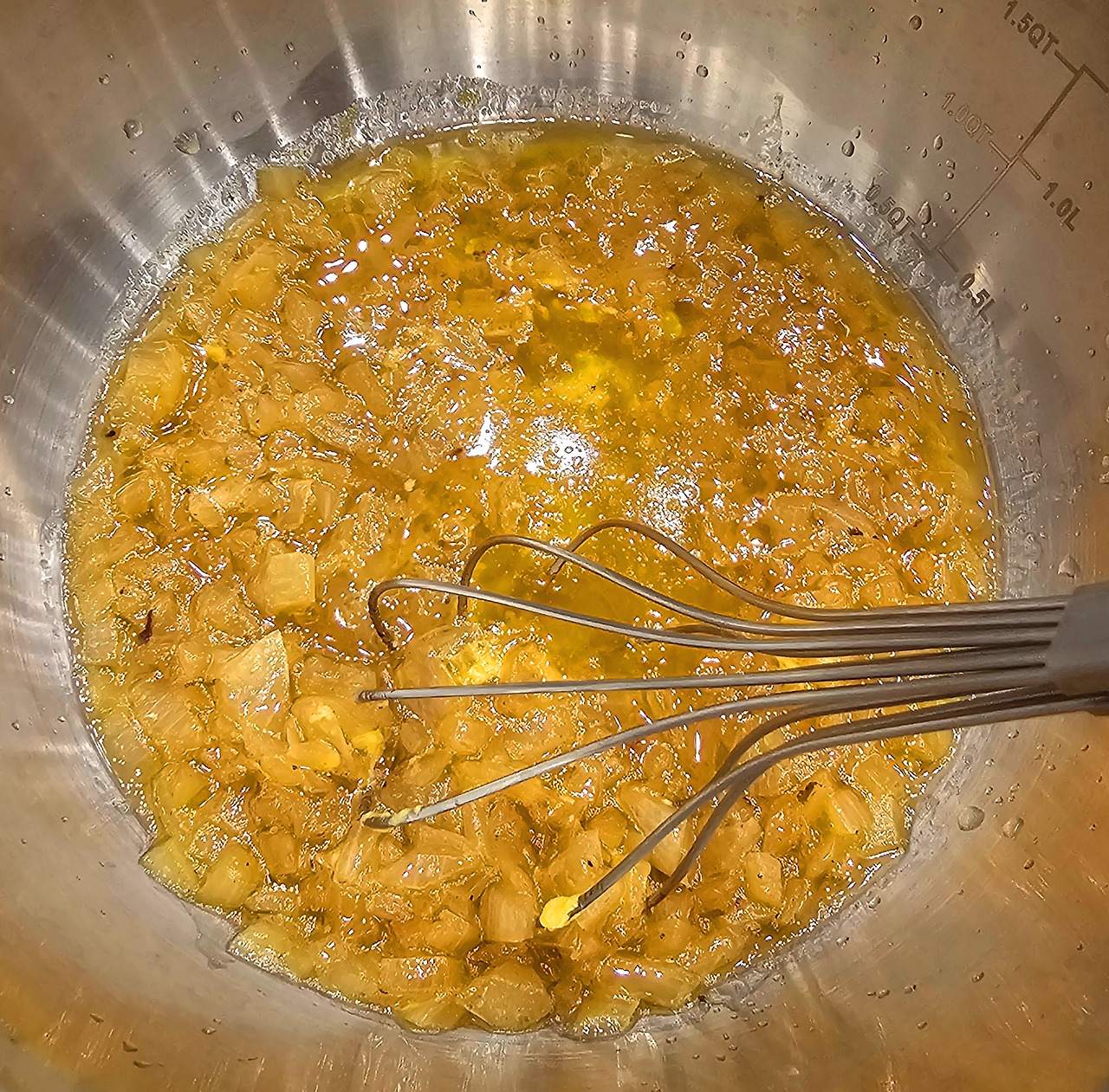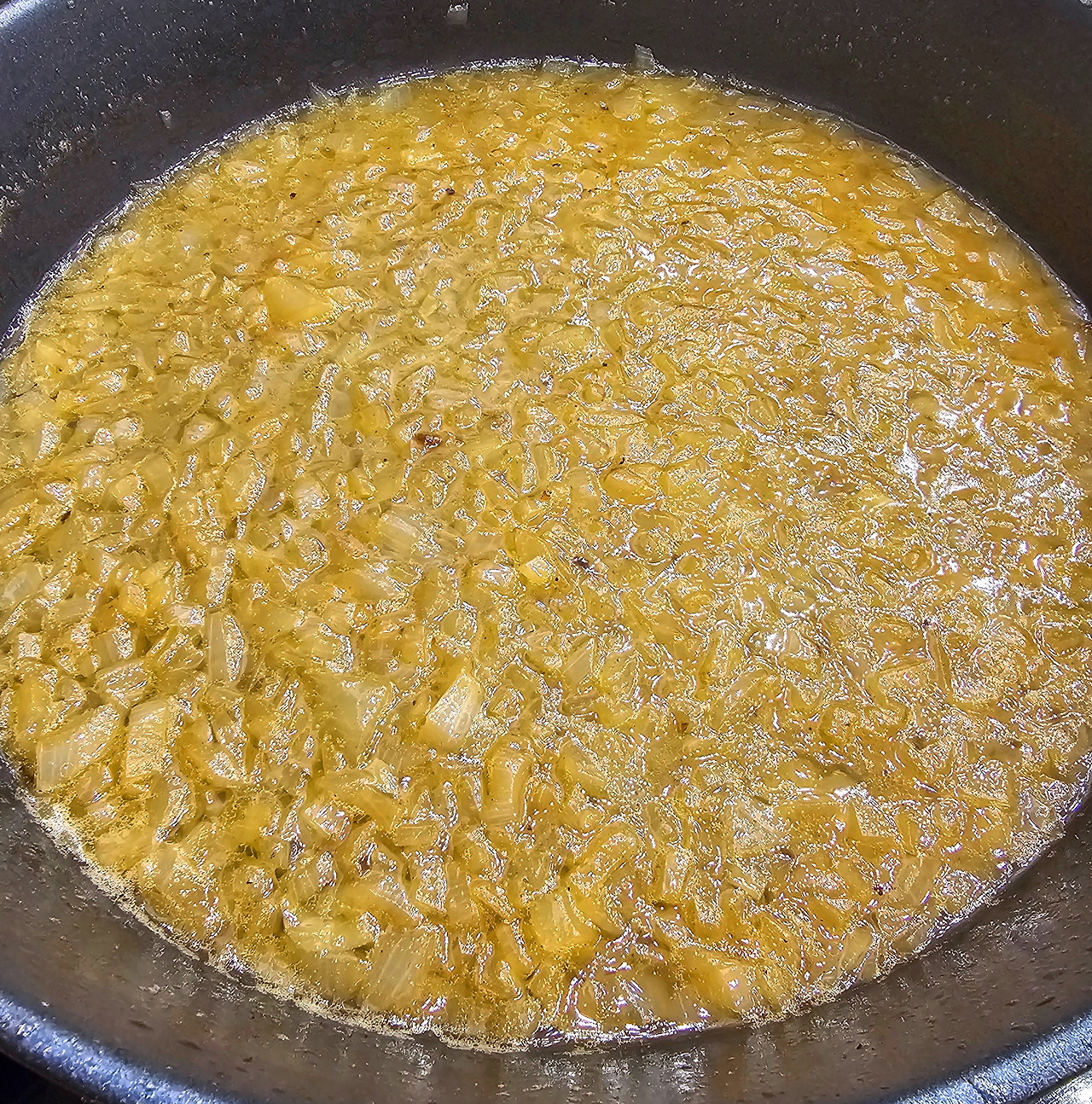 고기를 구운 프라이팬에 버터와 다진 양파를 넣고 볶기 시작한다. 양파 색깔이 변하려 할 때 화이트와인 비니거(와인을 발효시킨 식초)를 부어주고 끓여준다. 잠시 뒤에 화이트 와인을 넣고 소스 색이 나기 직전까지 끓인 다음, 쇠고기 육수를 넣고 약한 불에서 20분 정도 추가로 끓여준다. (끓이는데 상당한 시간이 소요돼서 다리가 아프다.)