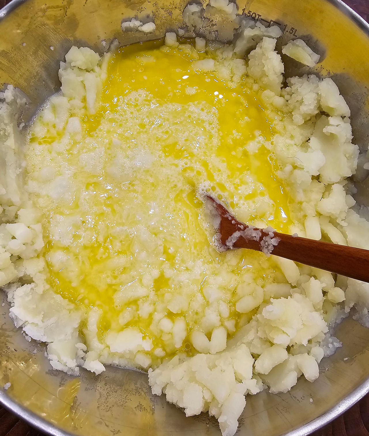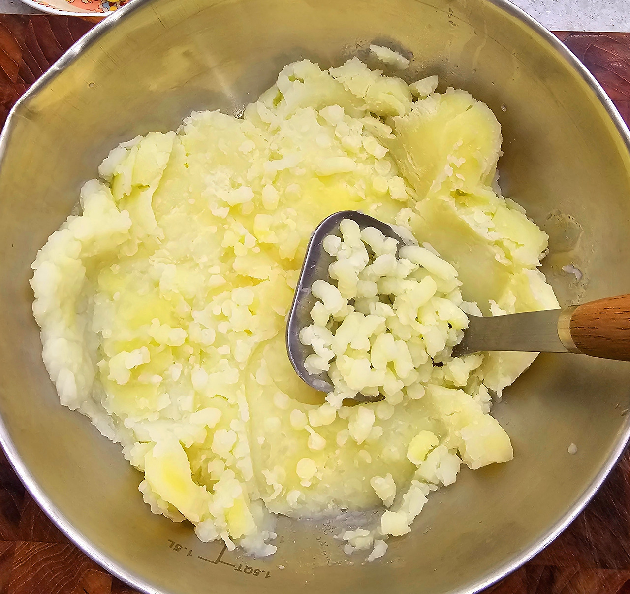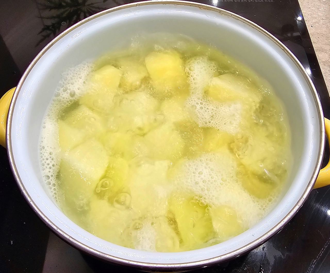 감자는 껍질을 벗겨 잘 씻고 익기 쉽게 자른 다음, 굵은소금을 넣은 냄비에 넣고 삶아 준다. 어느 정도 시간이 지나면 젓가락으로 찔러보면 익었는지 확인을 할 수 있다. 감자가 충분히 삶아졌으면 볼에 담아 으깨기 시작한다. 부드러운 식감을 원한다면 부지런히 으깨야한다.