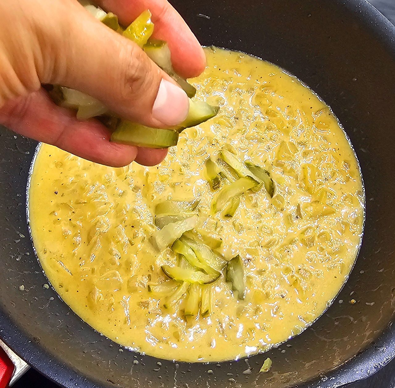 이제 볼에 디종 머스터드를 담고 열심히 끓인 소스를 조금씩 부어 가면서 거품기로 잘 저어 준다. 어느 정도 섞이면 소스 냄비에 부어주고 간을 맞춘다. 이때 팔팔 끓이면 소스가 분리가 된다고 하니 주의해야 한다. (난 교재 대로 말을 잘 들어서 분리가 안 됐다. 잘했어.) 이제 길고 얇게 썬 피클만 넣어주면 소스는 완성이다.