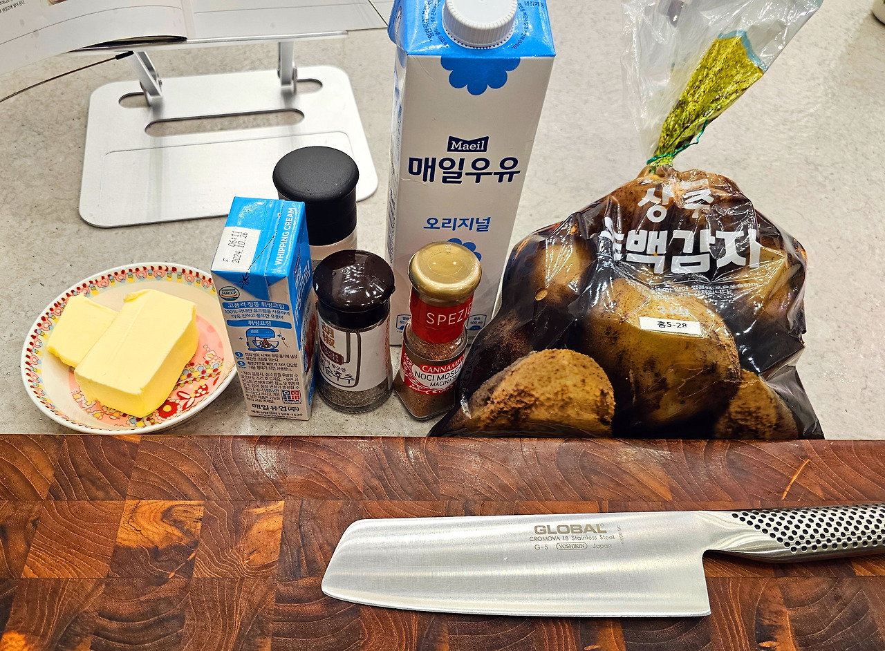 감자, 우유, 생크림, 소금, 후춧가루, 너트메그(육두구)