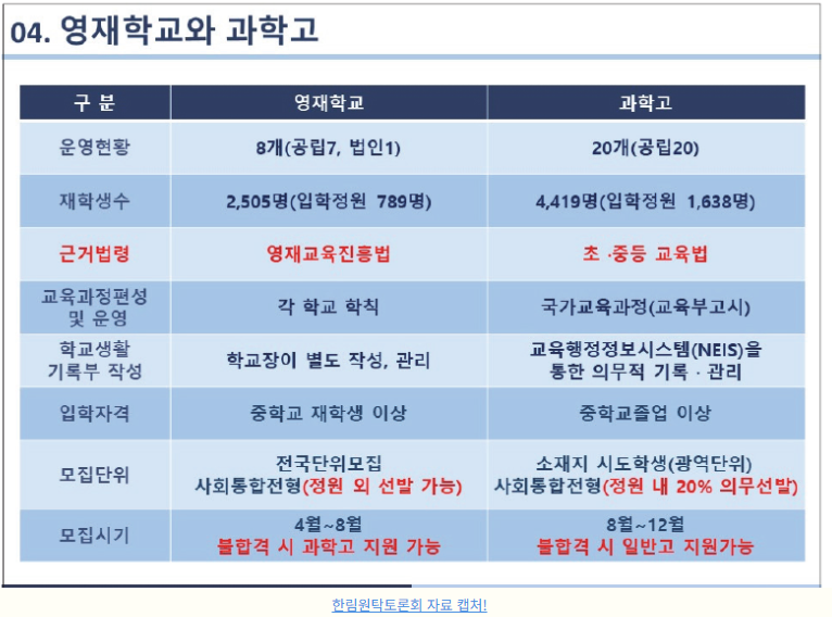 일반적으로 영재고는 자체 시험을 따로 치르기 때문에 스스로 준비하기가 쉽지 않습니다. 공교육 교사로서 고등학교 입시에 사교육이 필요하다고 주장하는 것이 민망하지만 과학고·영재고는 소수가 준비하는 과정이라서 이에 특화된 학원에서 축적한 나름의 정보와 문제의 도움을 받는 것이 수월합니다. 공교육에서도 영재성이 있는 학생들을 선발하고 관리하려 하지만 객관화된 평가를 하기가 쉽지 않고(줄 세우기 평가를 지양하는 분위기), 선발하여 관리하는 것 자체에 민원이 있으며 소수의 학생을 따로 관리할 인력이 부족하여 평균의 학생에게 맞춰진 교육을 할 수밖에 없는 현실적 문제가 있기 때문입니다.