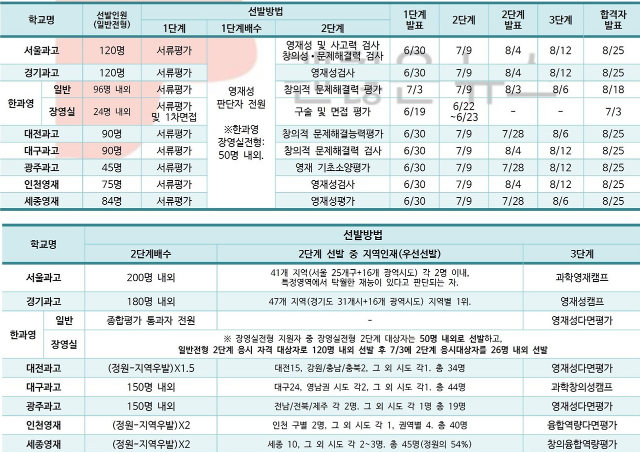영재고 입시는 3단계 전형에 자체 영재성 검사를 치르는 것과 달리, 과학고는 영재성 검사를 따로 치르지 않고 중학교의 수학·과학 내신 성적, 경시대회 성적을 참고합니다. 과학고는 다음의 20개 학교가 있으며 선발 방식은 조금씩 변화가 있어 당해년도의 학교 홈페이지를 참고하는 것이 가장 정확합니다. 영재학교와 달리 지원 가능한 과학고등학교는 1~2개만 있어 반드시 해당 학교의 입학 요강을 참고해야 합니다.
