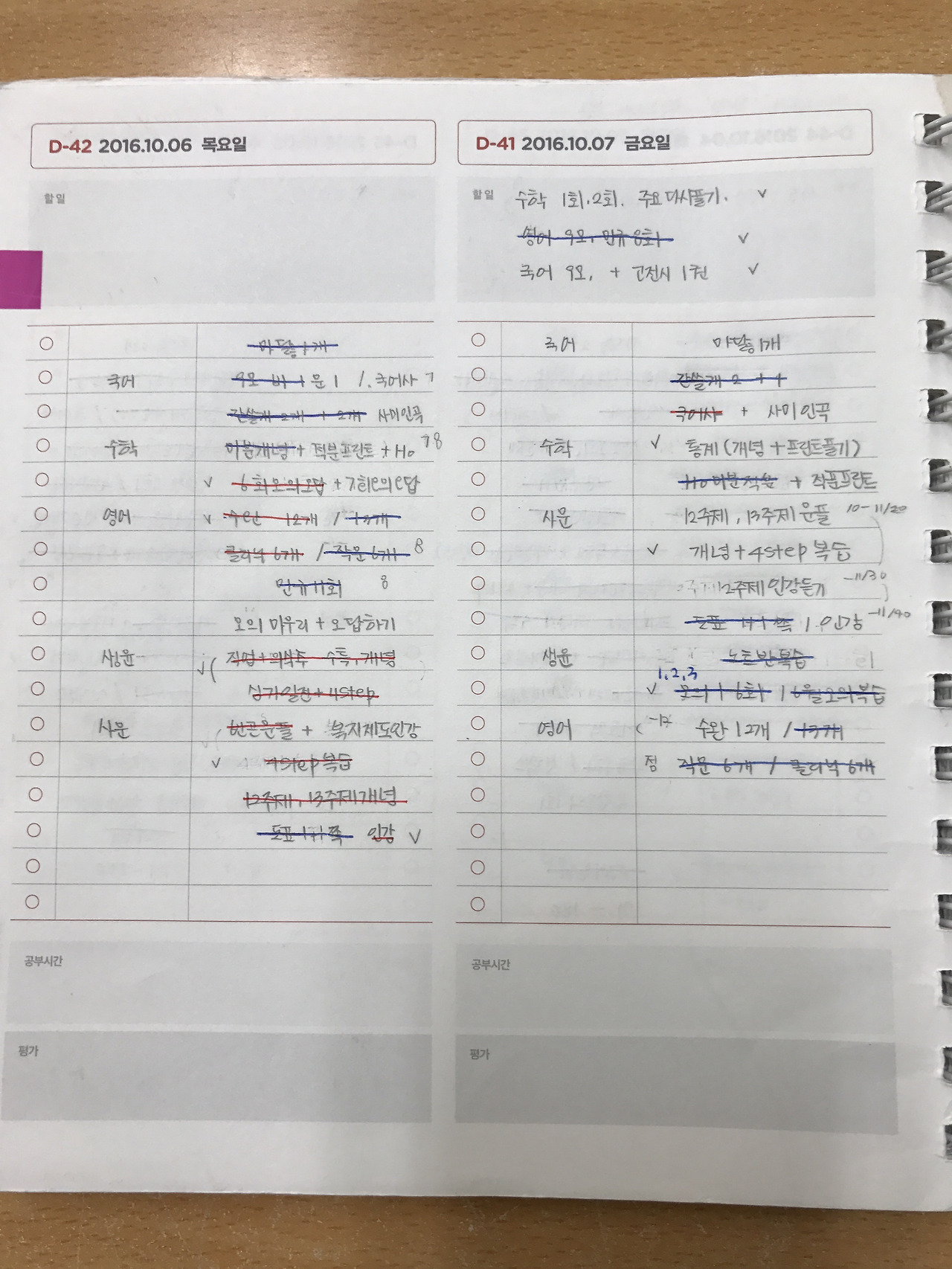 이양은 학기 중에 두 종류의 플래너를 쓴다. ▲A4 한 장짜리 월별 플래너와 ▲수첩 형태의 일별 플래너다. 월별 플래너는 중간·기말고사 한 달 전에 시험 대비용으로 만든다. 책상 앞에 붙여 일정을 한눈에 볼 수 있도록 A4 용지를 이용한다. 자와 펜을 활용해 종이를 30칸(30일)으로 나누고 각 공란에 할 일을 적는다. 시험 2주 전에 전 과목 전 범위를 한 번 이상 공부하고, 남은 기간에 복습을 반복하도록 일정을 구성한다. 주요 과목은 시험 당일까지 총 다섯 번가량 다시 보는 스케줄이다. 이양은 “복습할수록 시간이 줄어든다. 처음 공부할 땐 일주일, 두 번째는 3일, 세 번째는 하루 걸리는 식”이라고 설명했다. 일별 플래너에는 월별 플래너 내용을 구체적으로 푼다. 월별 플래너에 ‘국어 복습’이라고 표기했다면, 일별 플래너에는 ‘국어 oo문제집 oo쪽까지’라고 쓴다. 주로 학급 조례 직후 5분간 쓰면서 그날 해야 할 일을 가늠한다. 이양은 “일별 플래너에 자투리 시간에 할 일까지 명시한다”고 했다. “쉬는 시간이나 등·하굣길 이동 시간에 외울 영단어나 풀 문제집 범위를 적어뒀어요. 자칫하면 아무렇게나 흘려보내기 쉬운 10분이지만, 그게 모이면 꽤 긴 시간이 되거든요. 틈틈이 할 일을 명확하게 정하고 지켰던 덕분에 하루를 알차게 쓸 수 있었어요.” ◇방학 플래너는 30분 단위로 작성해야 효율적 방학 플래너는 30분 단위로 할 일을 구분해 쓴다. 학습 과목과 분량만 써뒀던 학기 중 플래너와의 차이점이다. 이양은 “방학 중엔 자습 시간이 매우 길기 때문에 학습 상태를 자주 체크해야 시간을 빈틈없이 쓸 수 있다”고 했다. 그는 “온종일 자습하면 지치기 쉽다. 장기적으로 보면 30분씩 가볍게 끊어 확인하며 공부하는 것이 더 효율적”이라고 덧붙였다. 특이한 점은 계획 세울 때 예상 소요 시간을 다소 짧게 잡는다는 것이다. 예컨대 2시간 걸리는 일에 1시간 50분을 배정한다. “마음에 여유가 생기면 집중력이 떨어져요. 긴장이 풀려서 괜히 다른 일이 눈에 들어오는 거죠. 몇번 시행착오를 거친 뒤, 이제는 예상 시간을 여유 없이 설정해 공부 효율을 올리고 집중력을 유지합니다.” 그는 “주변을 보면 2시간 걸리는 일을 2시간 30분으로 써둬야 마음이 안정돼 학습 효율이 오르는 친구들도 있다”며 “다양한 방법을 모두 시도해보면서 자신의 공부 스타일을 파악하고 가장 적합한 것을 적용하면 좋을 것”이라고 조언했다. 그는 “플래너에 기록된 흔적은 내가 계속 공부할 수 있도록 해주는 원동력”이라고 했다. “지난 학습 내역을 보면 ‘내가 이만큼 꾸준히 공부했구나’ 하는 생각이 들면서 뿌듯해요. 앞으로 무슨 과목을 더 공부해야 할지, 어느 단원의 훈련이 부족한지 스스로 파악할 수 있는 자료가 되기도 하죠. 그런 점에서 플래너는 제 학습의 길잡이라고 볼 수 있겠네요.”
