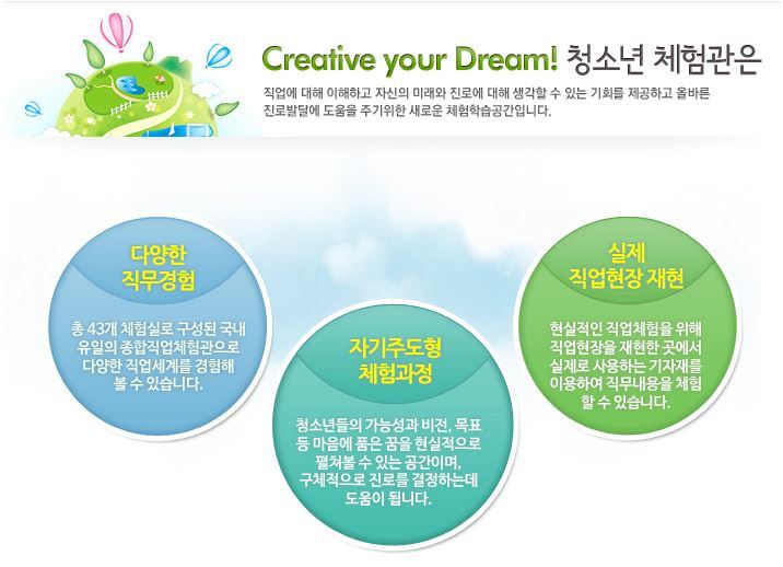이곳에는 만 11세 이상의 청소년체험관이 별도로 있어 방학이나 시험이 끝난 학기말에 가볍게 다녀오기 좋습니다. 유아 때 체험이 흥미 위주라면 중고등 시절에 진로 체험을 하는 것은 구체적인 진로를 생각해 보는 데 실질적인 도움이 됩니다.
