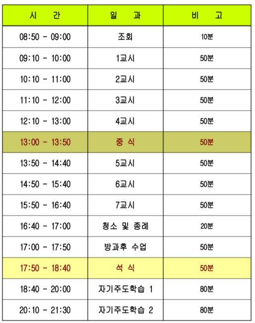 중학교는 고등학교보다 주당 수업시수가 적습니다. 보통 3일은 6교시, 이틀만 7교시 수업을 합니다. 게다가 수업 시간도 45분에서 50분으로 늘어나 고1 학생들은 입학 후 빡빡한 학교 수업에 적응하는 것만으로도 힘겨워합니다. 다음은 인문계 고등학교 1학년 시간표의 예시입니다.