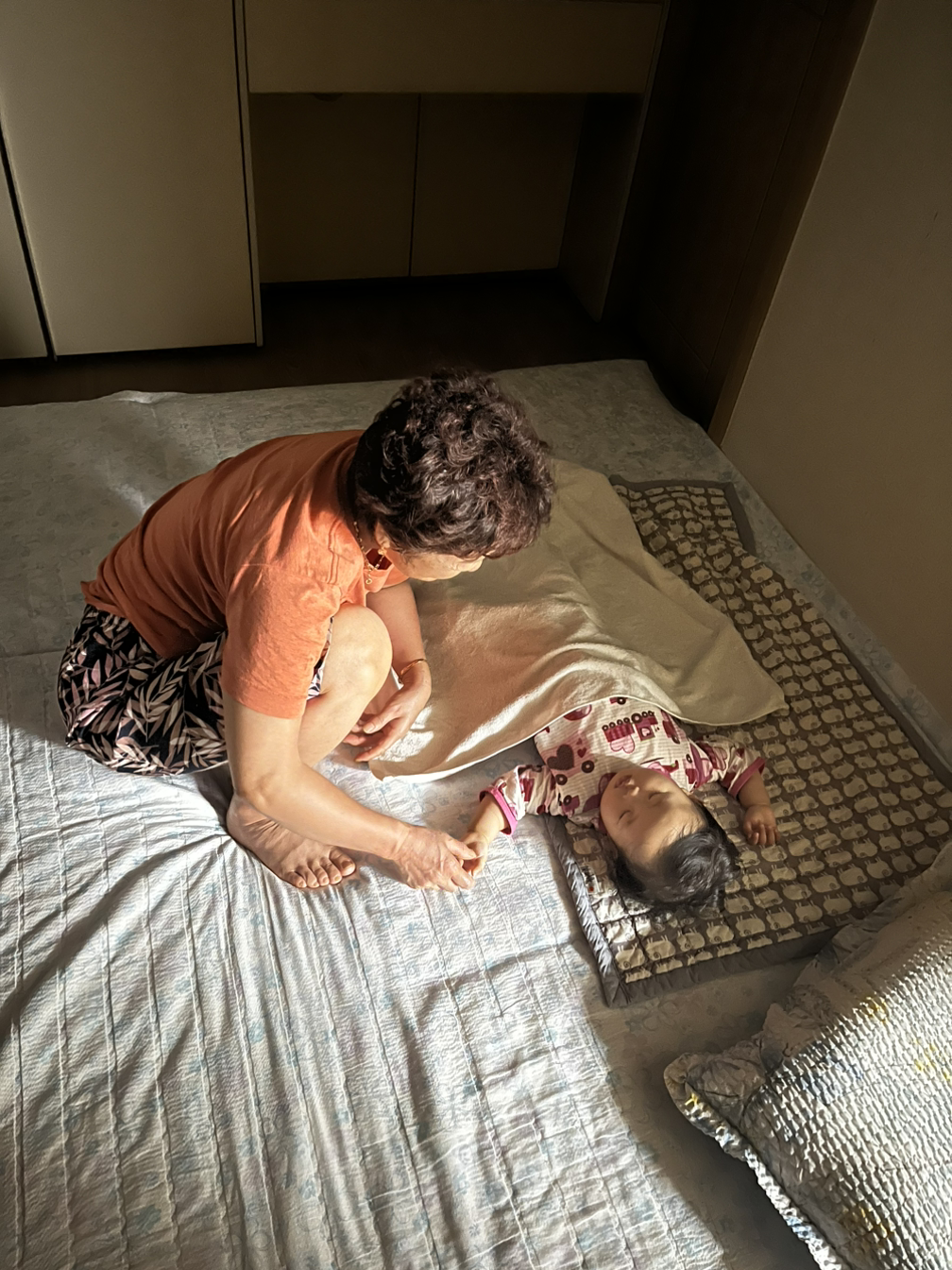 가끔씩은 부모님이랑 말할 땐 퉁명스럽다가 딸한테는 세상 다정한 말투로 말하는 나를 보며 흠칫 놀랄 때가 있다. 놀라움 뒤에는 머쓱한 감정이 뒤따라온다. 그래서 친정집이 아닌 신랑이랑 사는 집이었다면 더 오버스럽고 재미있게 놀 수 있는데 그 노력을 접어두게 된다. 그러면서 부모님에게 미안한 마음이 딸에게도 번진다. 미안한 마음이 마음속에 번지면 ‘내가 뭐 하는 건가 ‘하는 생각이 든다. 그러면 또 마음이 무겁다.