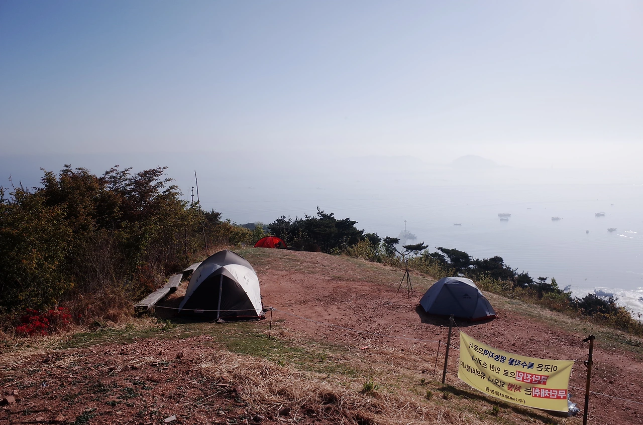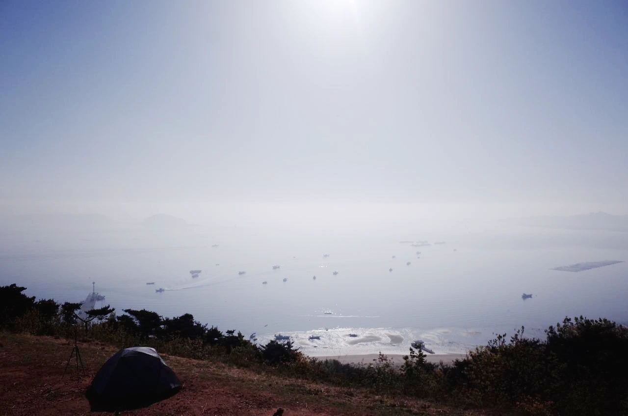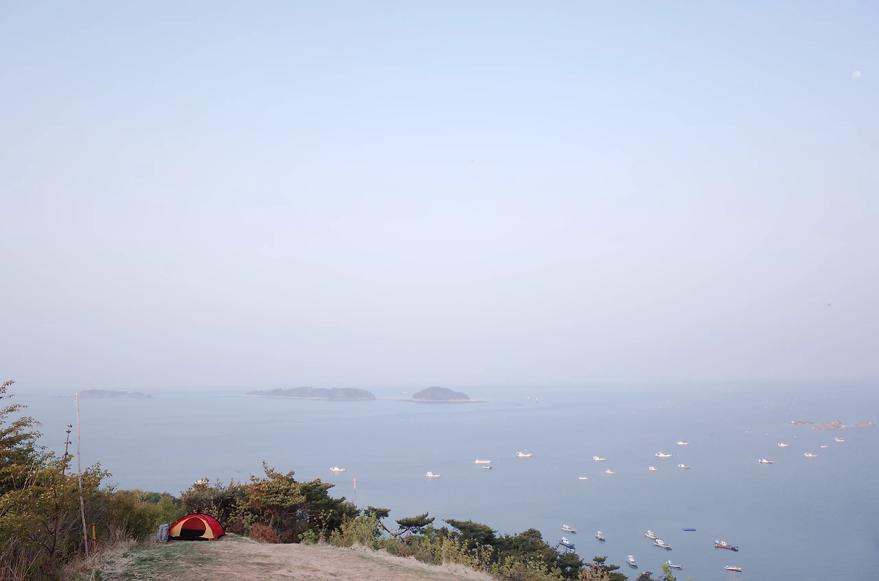 10분 정도 오른 것 치고 꽤 괜찮은 풍경을 선사해 준다. 텐트 너머로 시원한 바다조망이 한눈에 들어온다. 어촌 마을답게 고깃배들이 동동 떠나는 모습이 정겹다.