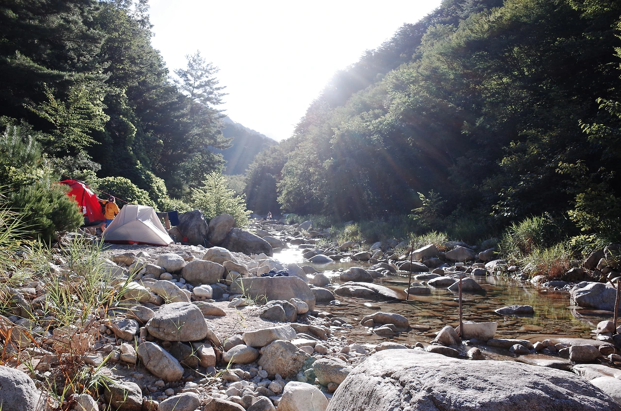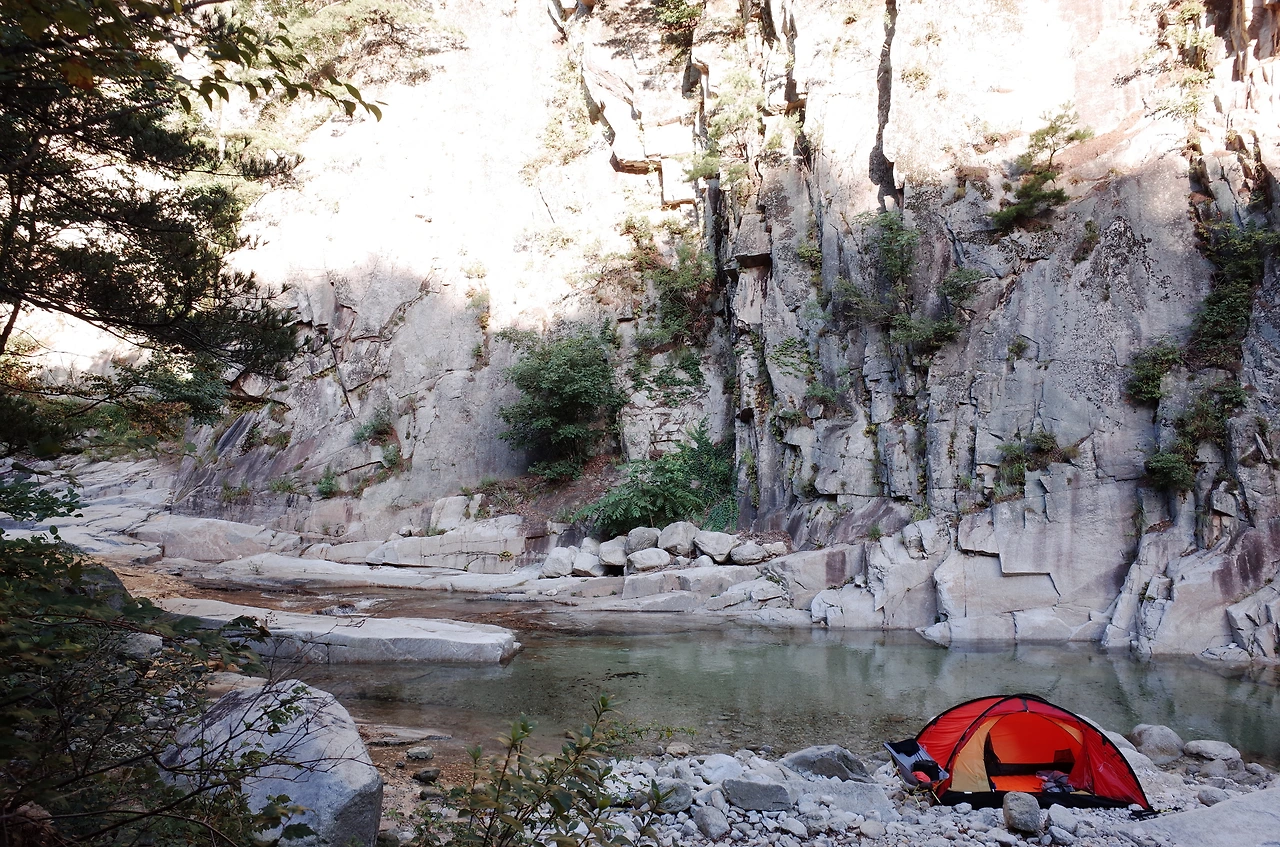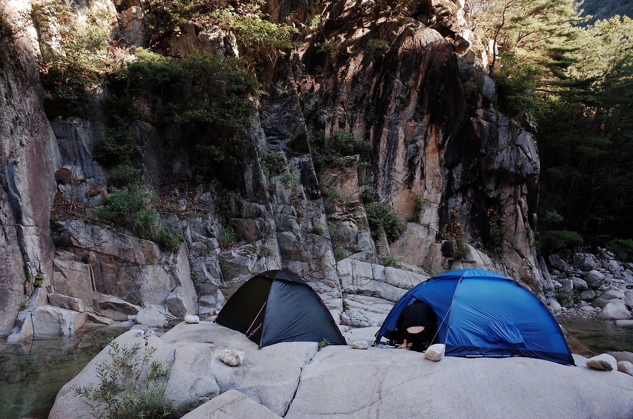 계곡에 도착해서 텐트를 설치한 뒤에 입고 있던 옷을 벗어던지고 계곡물에 뛰어들었다. 살얼음 같은 계곡물이 몸에 닿는 순간 피곤함이 사르르 녹는다. 산으로 백패킹을 가게 되면 땀과 뒤범벅된 습기 때문에 잠을 이루기 힘들 때가 있지만 오늘은 꿀잠을 잘 수 있을 것 같다.