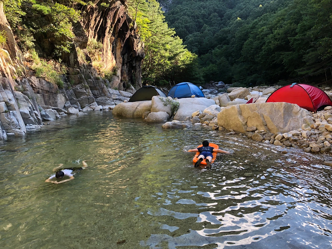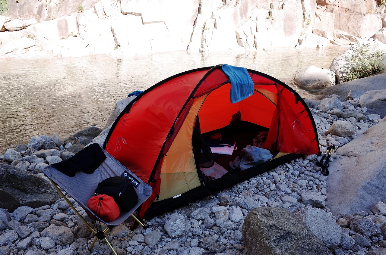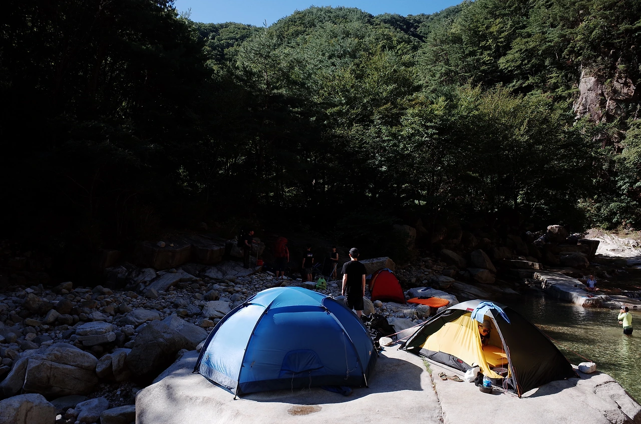 계곡에 도착해서 텐트를 설치한 뒤에 입고 있던 옷을 벗어던지고 계곡물에 뛰어들었다. 살얼음 같은 계곡물이 몸에 닿는 순간 피곤함이 사르르 녹는다. 산으로 백패킹을 가게 되면 땀과 뒤범벅된 습기 때문에 잠을 이루기 힘들 때가 있지만 오늘은 꿀잠을 잘 수 있을 것 같다.