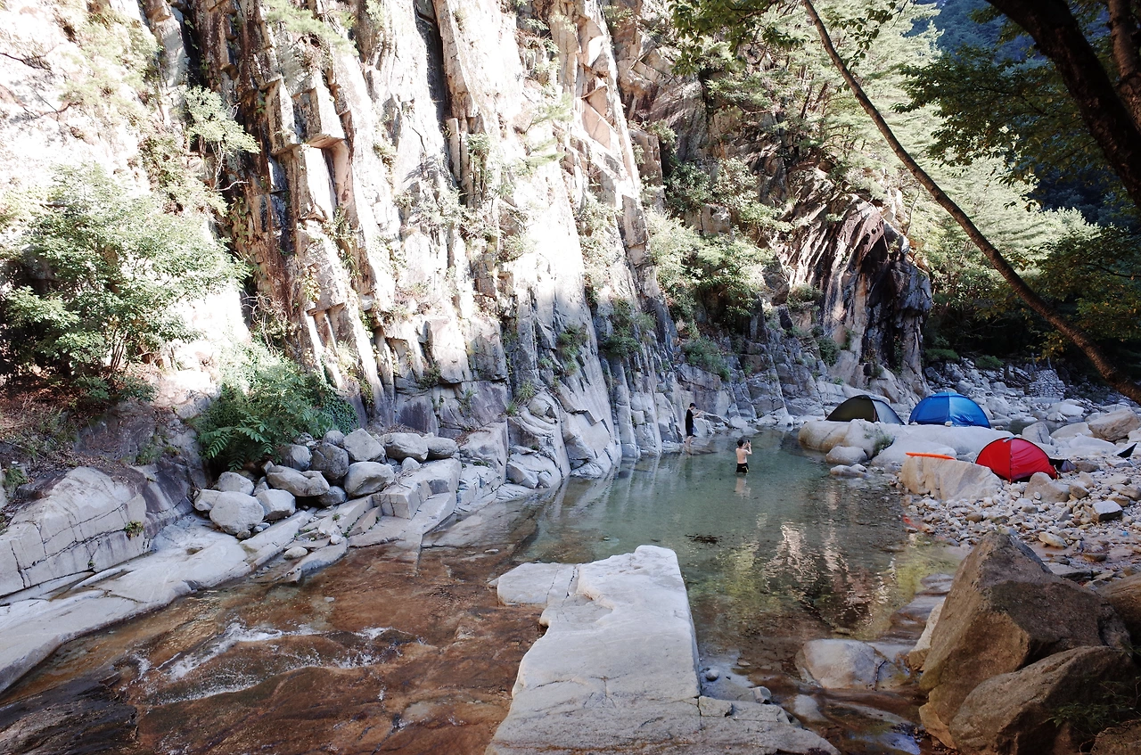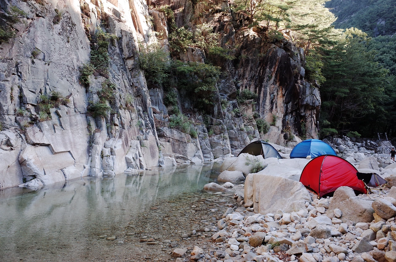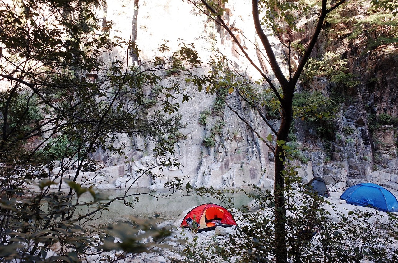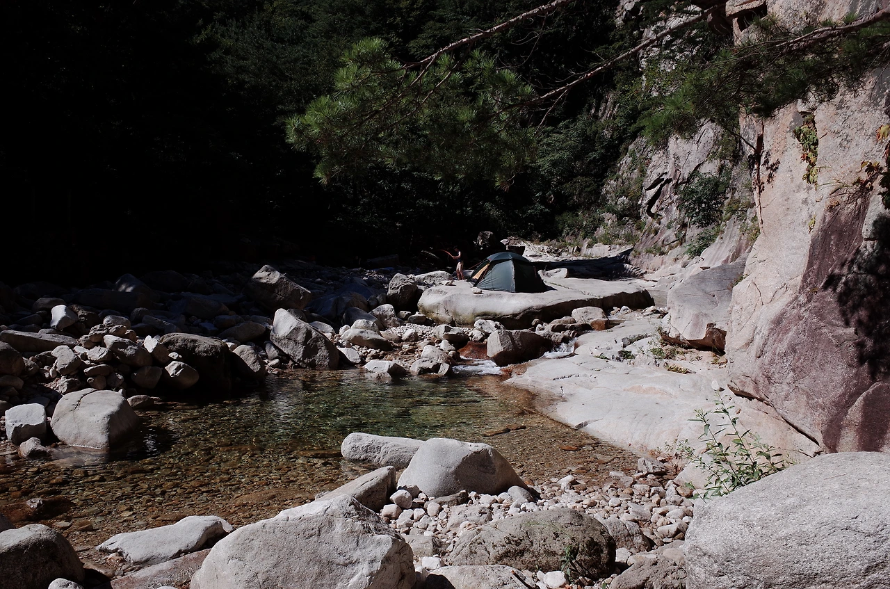 사람 목소리가 들리는 쪽으로 조금 더 걸었더니 무너진 다리와 계곡 물소리가 선명하게 들렸다. 워낙 늦게 출발한 터라 해가지고 도착해서 위치 분간이 잘되지 않았지만 바로 앞에 큰 용소가 있어서 계곡 바로 옆 바위와 근처 공터에 자리를 잡기로 했다.