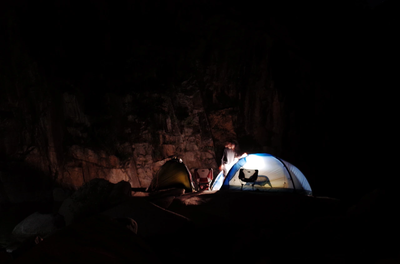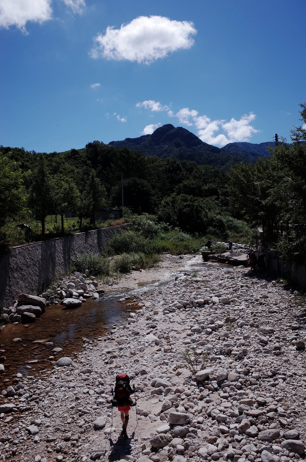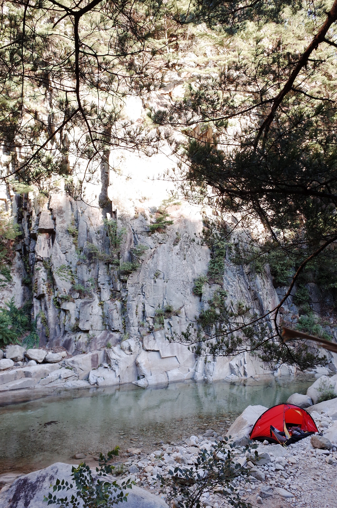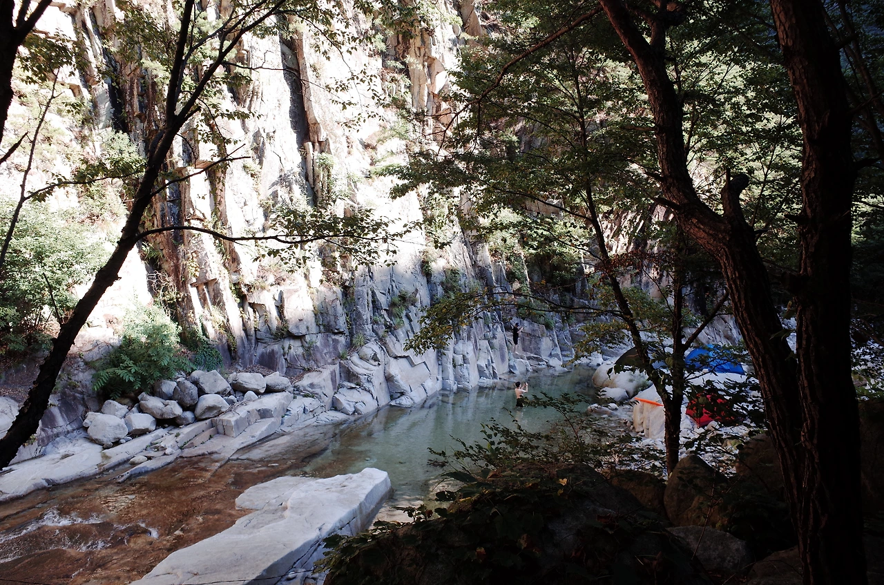 사람 목소리가 들리는 쪽으로 조금 더 걸었더니 무너진 다리와 계곡 물소리가 선명하게 들렸다. 워낙 늦게 출발한 터라 해가지고 도착해서 위치 분간이 잘되지 않았지만 바로 앞에 큰 용소가 있어서 계곡 바로 옆 바위와 근처 공터에 자리를 잡기로 했다.