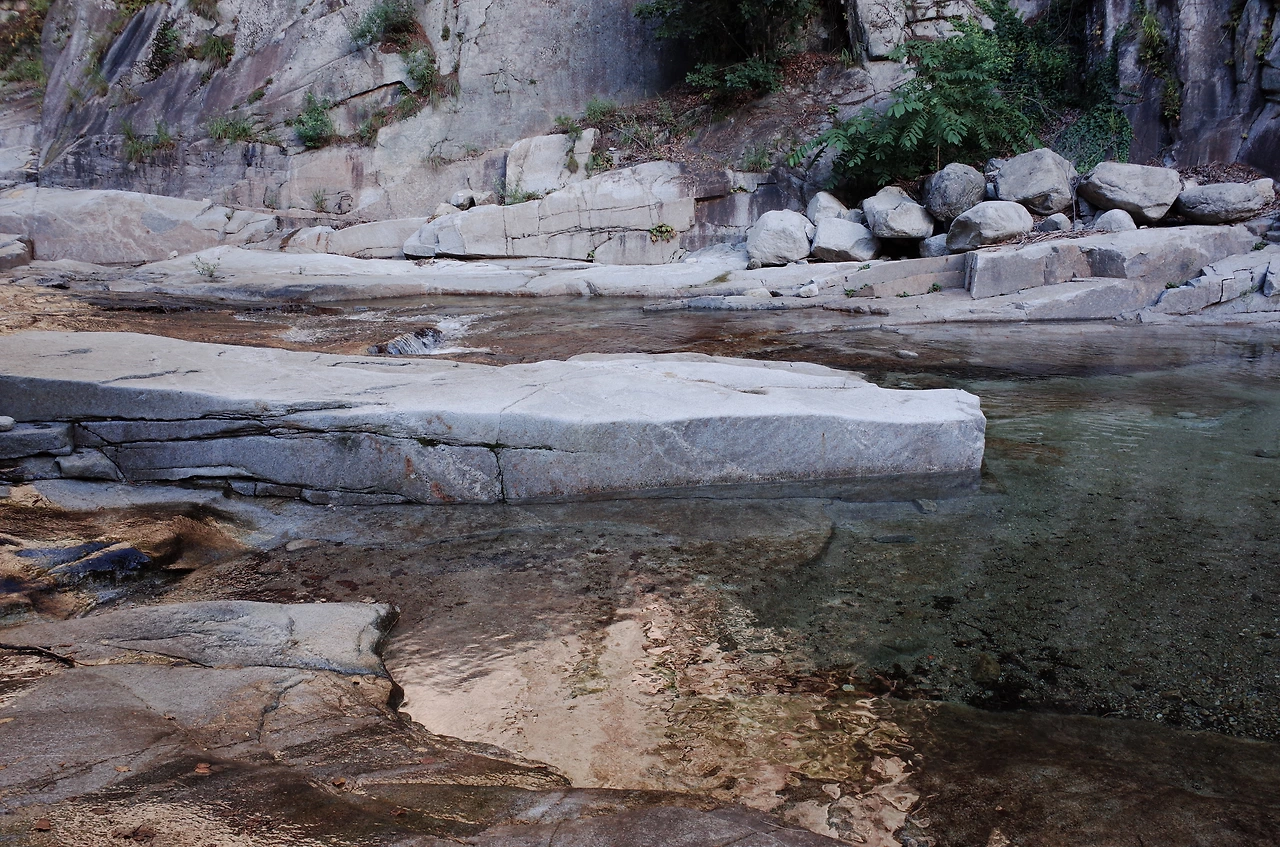 도마치 계곡 캠핑장 근처에 차를 세우고 계곡 위쪽으로 향했다. 시작부터 난관이었다. 초입에서 계곡 물살을 가르고 지나야 하는 것은 알고 있었지만 예상보다 불어난 물 때문에 반바지를 한껏 올려도 흐르는 물살에 바지가 젖을 수밖에 없었다. 비록 바지는 점점 축축해졌지만 차가운 물에 다리를 담그고 움직이니 확실히 더위는 가시는 느낌이었다.