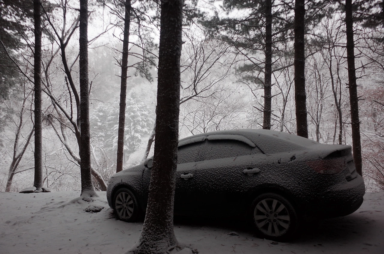 순식간에 쏟아진 눈 때문에 결국 차를 먼저 캠핑장 초입에 옮겨 놓기로 했지만
