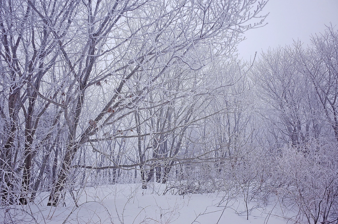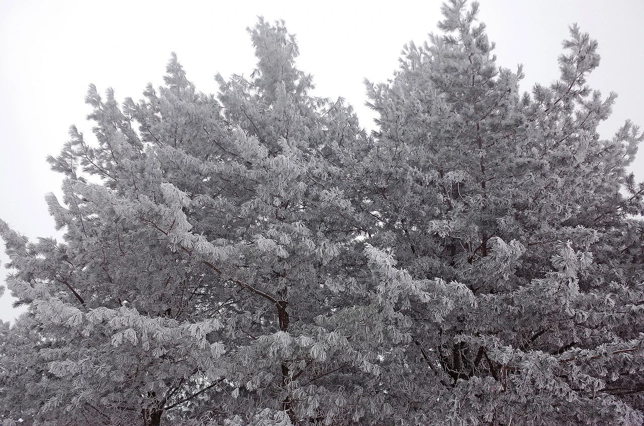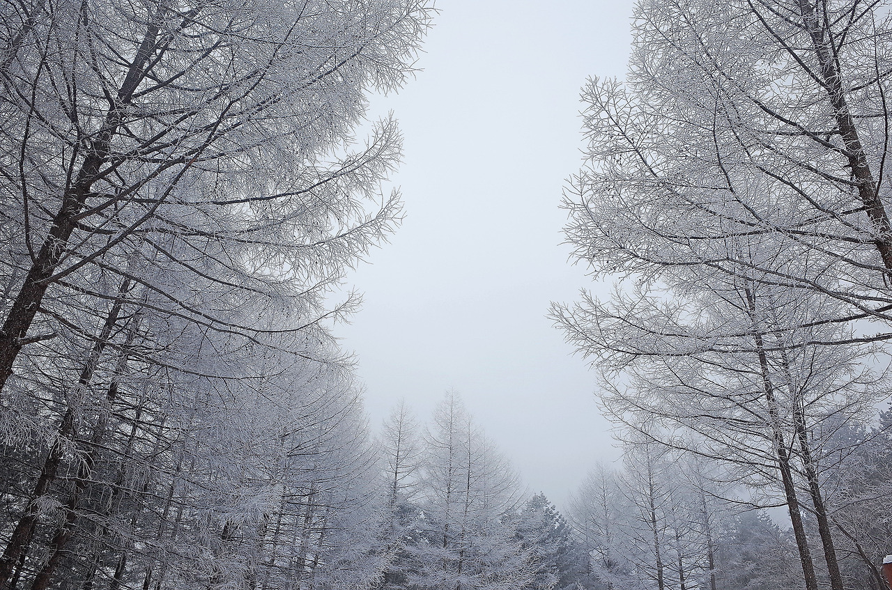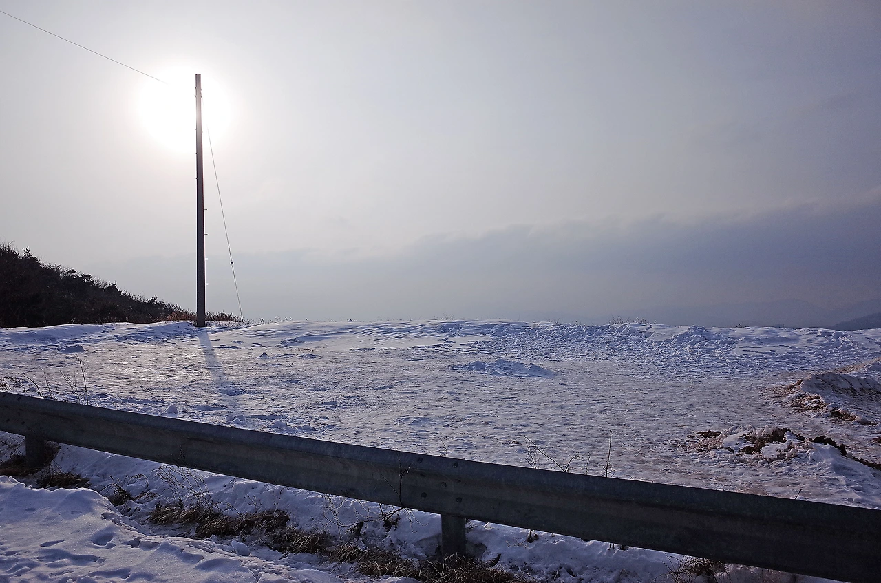 양구 두미재로 돌아가는 길에는 계속해서 약한 눈이 내린다. 흩날리는 눈과 안개가 돌아가는 아쉬움을 달래주는 듯 하얀 상고대를 선물해 주었다.