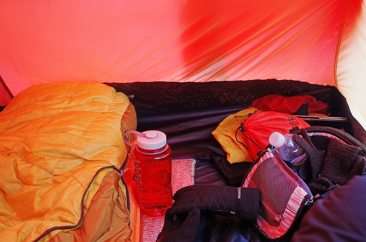 해길 무렵에 비박지에 도착했기 때문에 빠르게 쉘터와 텐트를 설치했다. 바닥은 울퉁불퉁하고 심한 냉기가 올라왔지만 생각했던 것보다 눈이 많이 쌓여 있어서 모든 게 용서가 됐다.