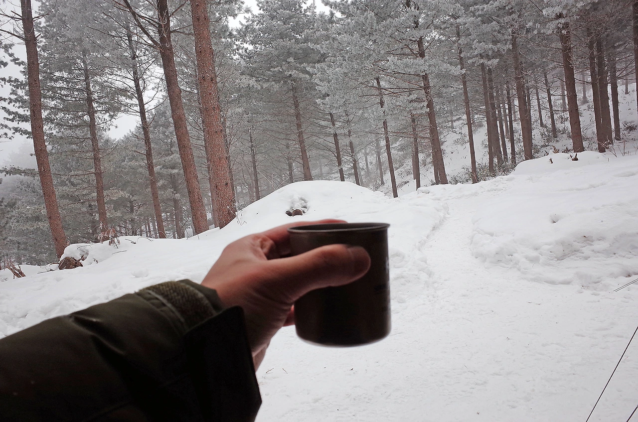 "아침은 안 먹더라도 눈 내리는 숲 속에서 커피를 한잔 안마실수 없지"