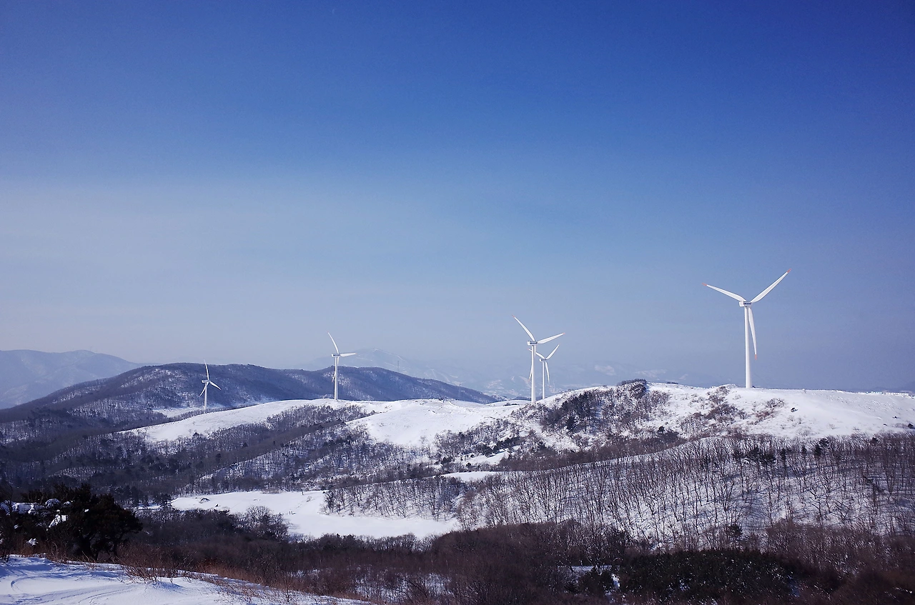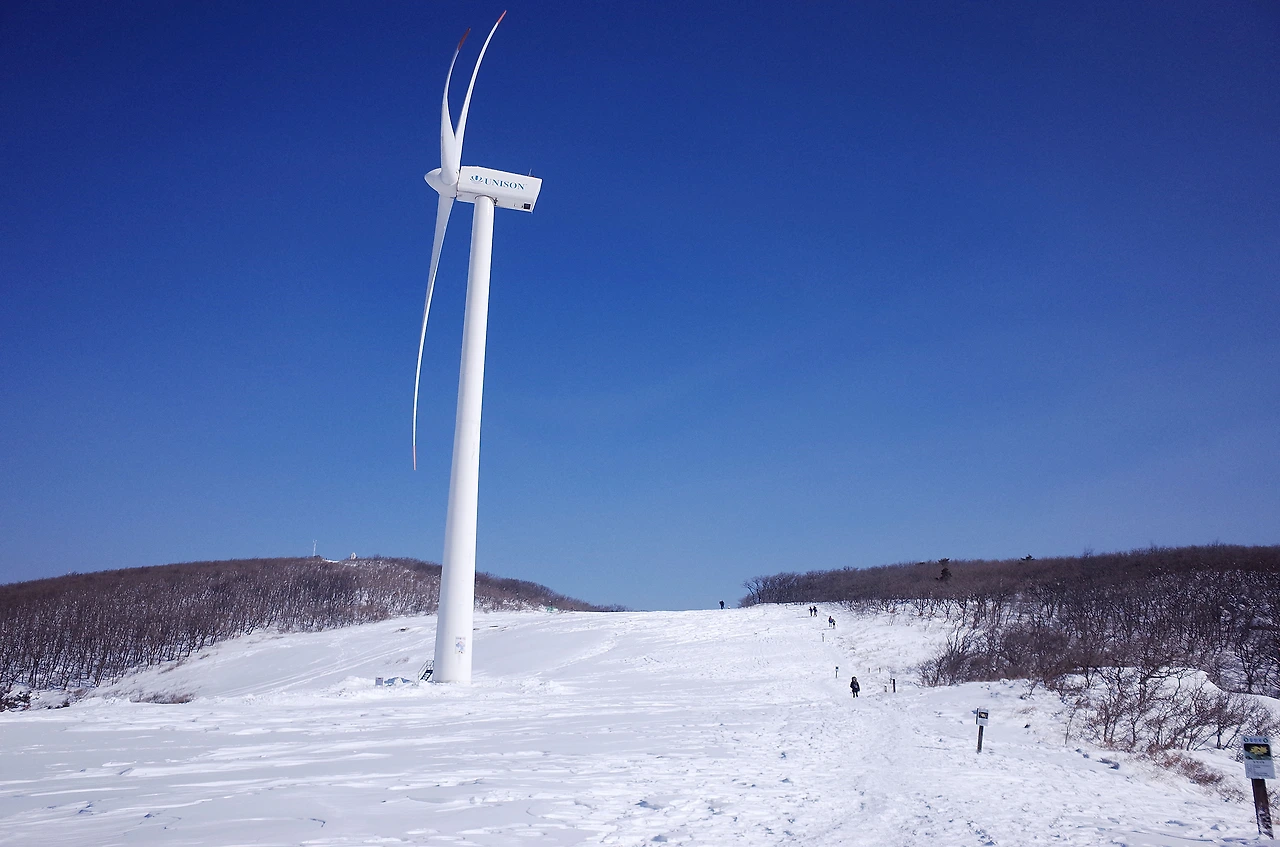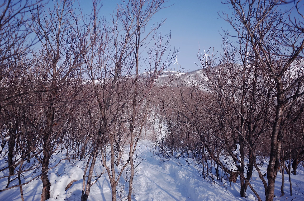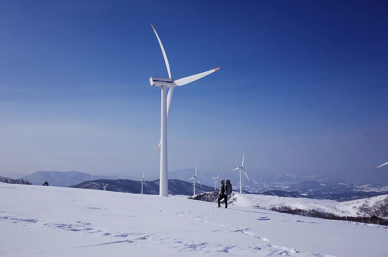 저 멀리 바람의 언덕의 상징인 풍력발전기가 보이기 시작한다. 얕은 능선길로 이어진 설경과 바람개비 때문에 언제부턴가 선량령의 눈꽃 산행지로 유명세를 떨치고 있다.