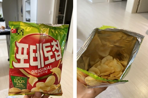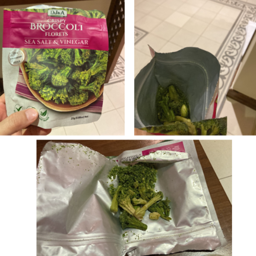 이번에는 외국 과자다. 동결건조한 브로콜리라고? 맛있겠네. 샀다. 봉지는 흔히 보는 에세이책 정도의 크기인데 안에 들어있는 건 사람 새끼손가락 한 마디 정도 되는 브로콜리 달랑 4조각에 약간의 시즈닝 가루가 전부다. 혼자 먹었기에 망정이지 누구랑 같이 먹기라도 했다면 되게 민망할 뻔했다.