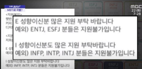 취업 관련 사이트에서는 MBTI의 어떤 유형이 유리한지 관심이 치열하고, 첫 글자가 외향적 성격을 뜻하는 'E'일 때 크게 유리하다는 것은 많은 기업들의 채용 결과들을 볼 때 이미 정설이다. 아예 특정 유형은 지원 불가로 못 박은 곳도 수두룩하다.