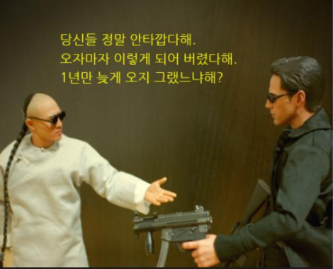 전라남도 담양에 가면 시원한 대나무 숲이 아주 좋다고 들었는데 이번 주말엔 거기라도 가서 외쳐 볼까. "여보쇼! 나 그런 말 몰라! 그런 말은 전생에서도 들어 본 적 없어! 그리고 당신도 직급만 달랐지 월급 받으면서 실적 만들고 윗사람 눈치 봐야 하는 나랑 똑같은 털 없는 노란 원숭이 아니오? 아니냔 말이오? 으이?"