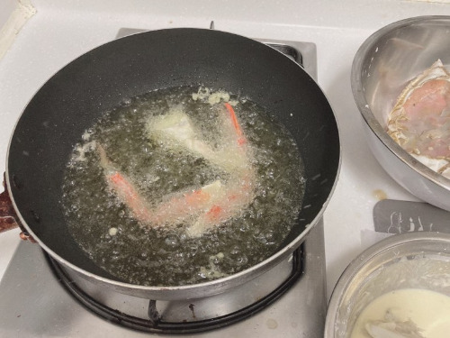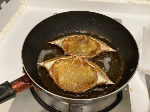 꽃게를 튀겨 주었어요. 반죽은 닭 튀길 때보다 약간 묽은 정도가 좋고, 한꺼번에 왕창 때려 넣으면 기름 온도가 확 내려가서 맛있게 튀겨지지 않아요. 군대에서 단체급식 청어 튀김이 비린 것도 그래서죠.