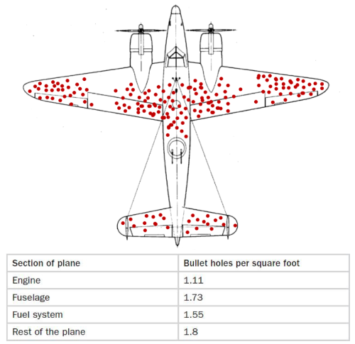 때는 1942년, 제2차 세계대전. 미국은 일본과의 태평양전쟁에서 작전에 투입되었던 전투기를 분석한다. 분석 결과 살아 돌아온 전투기들은 날개와 꼬리에 총탄을 많이 맞았고, 미국은 그 부분의 장갑을 강화하려 했다.