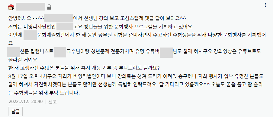 "네, 선생님이 OO에서 하시는 강연에 대해 얘기 듣고 연락드려요. 저희는 사단법인 OO라고 하는데요. 작년에는 사회적 기업으로 인증받고...(중략). 이번에 저희가 ....를 대상으로 강연회를 열려고 하는데, 선생님께 재능 기부를 좀 부탁드려도 될까요?"