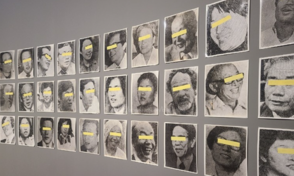 성능경은 여러 신문에 실린 다양한 얼굴들을 모아 근접촬영하고 눈에 노란색 띠를 붙였다. 당시 범죄보도에서 사람의 눈을 검은색 띠로 가리는 관행 때문에 검은 띠로 눈을 가리면 범죄자라는 의미가 덧칠된다. <특정인과 관련 없음>은 이렇게 사회적으로 무언합의된 판단의 권위에 의문을 제기한다. 일률적으로 붙인 노란색 띠는 긍정적 의미인지 부정적 의미인지, 각각의 사진들이 실렸던 기사는 원래 무엇이었는지 다같이 모호해지게 만들어 버리는 가면이다.