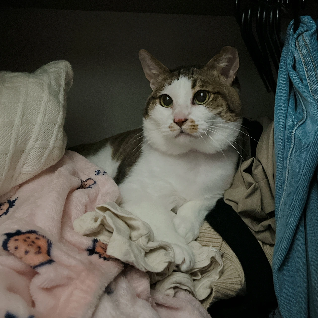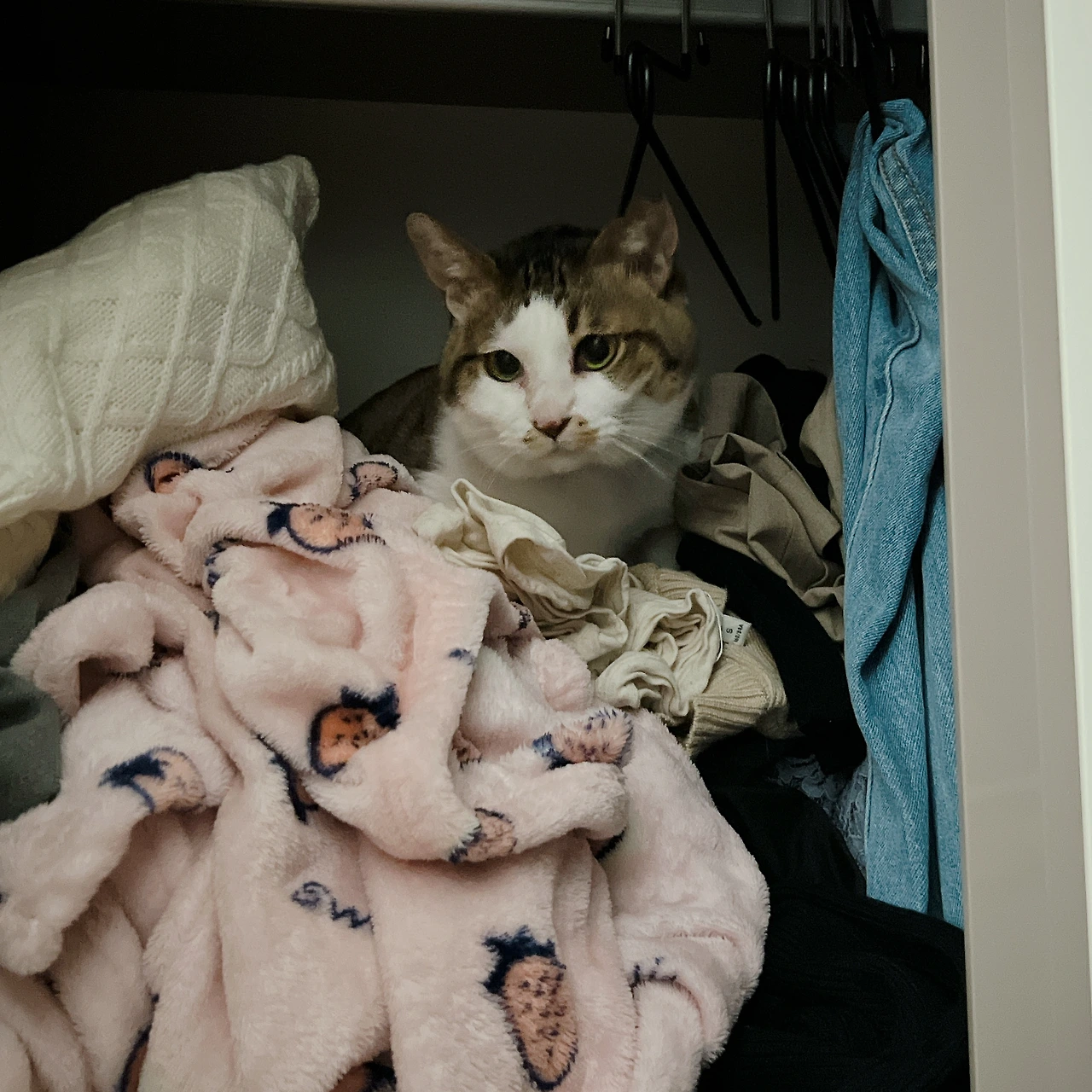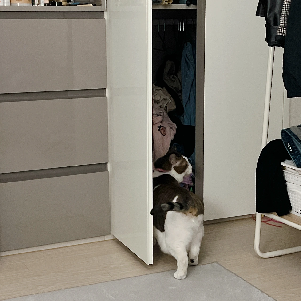 돌아와서 살펴보니 옷장 안 옷 무덤 사이로 막 자리를 정돈하는 꽁이와 눈이 마주쳤다.