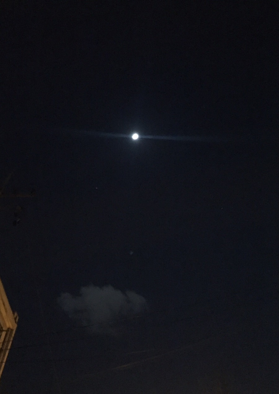 마치 우주선, 혹은 토성의 긴 고리처럼 옆으로 번진 보름달 한점.