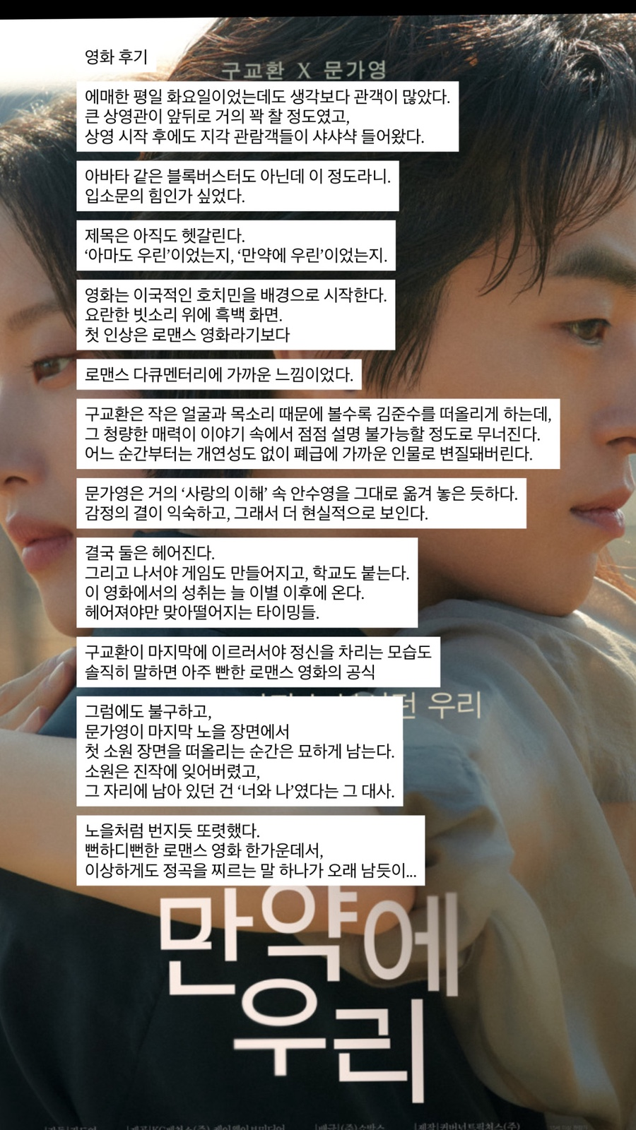 그럼에도 불구하고, 문가영이 마지막 노을 장면에서 처음 소원 장면을 떠올리는 순간은 묘하게 남는다. 소원은 진작에 잊어버렸고, 그 자리에 남아 있던 건 ‘너와 나’였다는 그 대사. 노을처럼 번지듯 또렷했다. 뻔하디뻔한 로맨스 영화 한가운데서, 이상하게도 정곡을 찌르는 말 하나가 오래 남듯이....