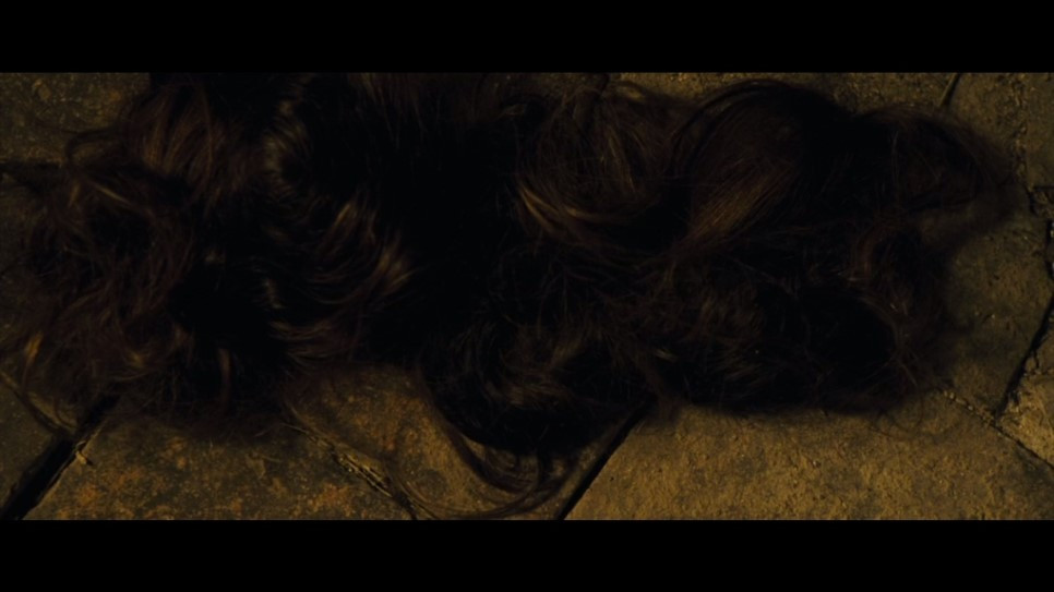 윤기 있는 검은색 머리카락이 스쳐 지나간 그녀의 납작해진 얼굴은 아직도 그 섬세한 윤곽과 신비스러움을 지니고 있었다. 그런데 머리카락이 남아있지 않았다. 살인자가 그녀의 옷과 함께 머리카락도 잘라서 가져가 버린 것이다.