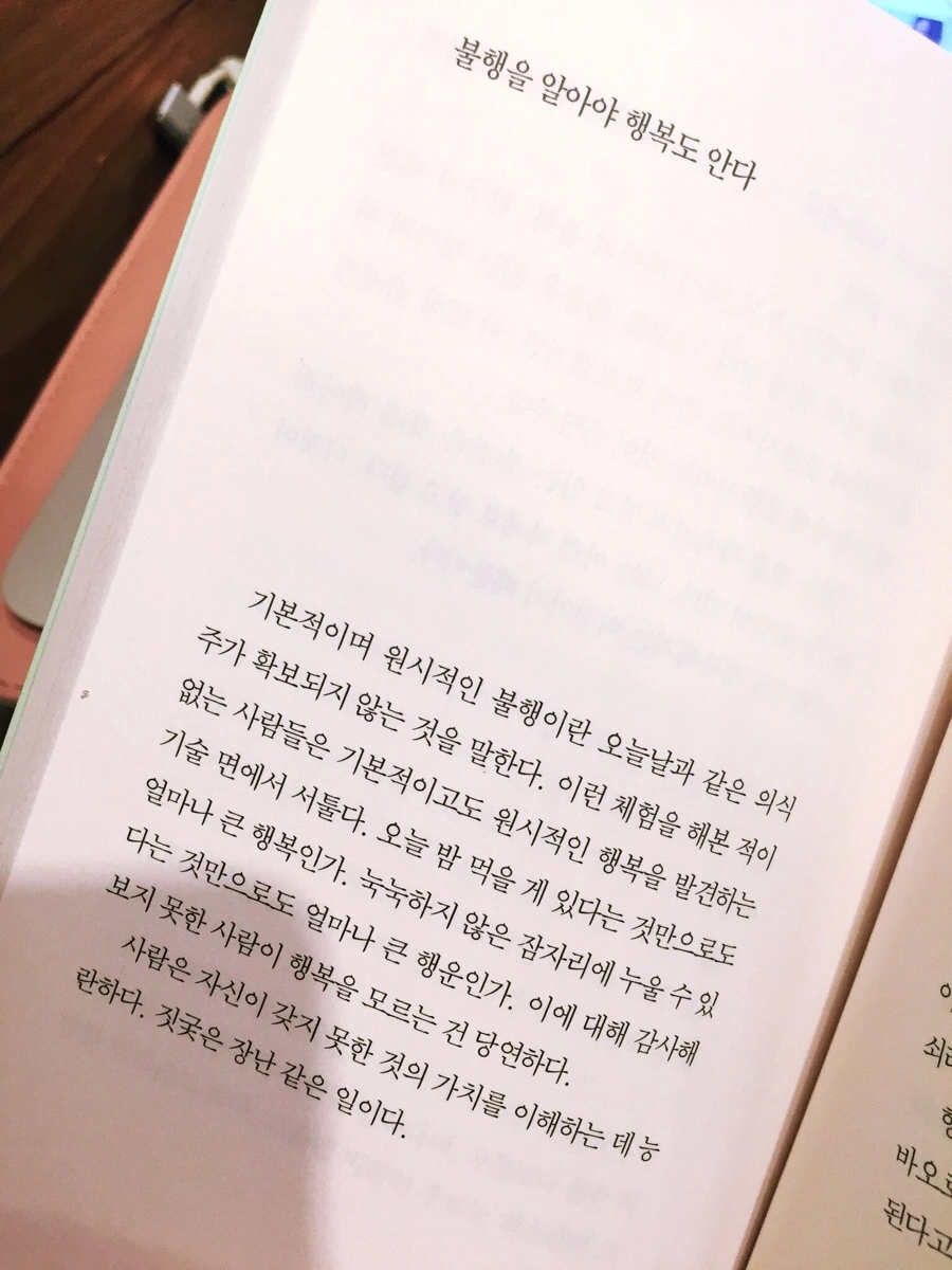 어둠 없이는 빛의 존재를 깨닫지 못한다. 인생이라고 다를 리 없다. 행복은 여간해서는 그 실태를 알아차릴 수 없지만 불행을 배우는 순간, 불행과 다른 행복의 존재를 상상하게 된다. 그러므로 불행은 생각만큼 손해는 아니다. 행복에 대한 갈망은 오직 불행한 가운데 키워지기 때문이다. 절망적인 운명을 똑바로 응시하지 않는 한, 희망의 본질에서 빛나고 있는 삶의 비밀은 영원히 드러나지 않는다.