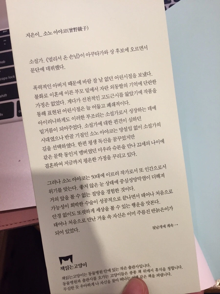 작가는 무척 감성적인 사람이며, 그녀가 빚어내는 위 문장들은 '거리'라는 단어가 당연할 만큼 시니컬하고 담백했다.