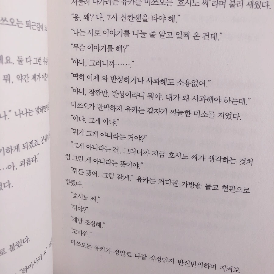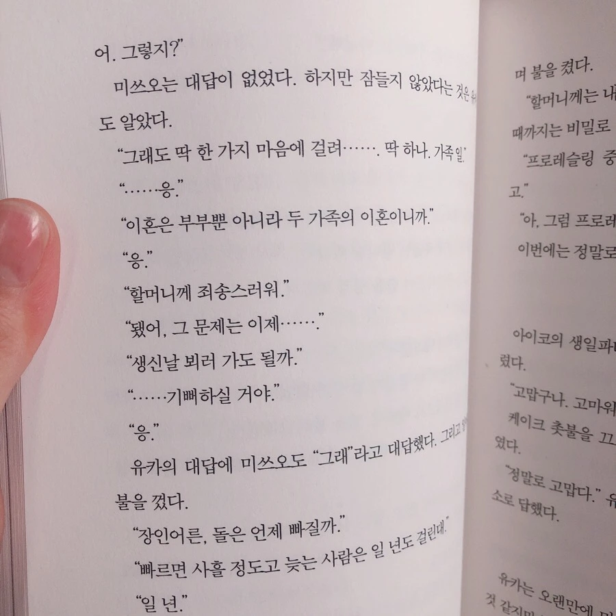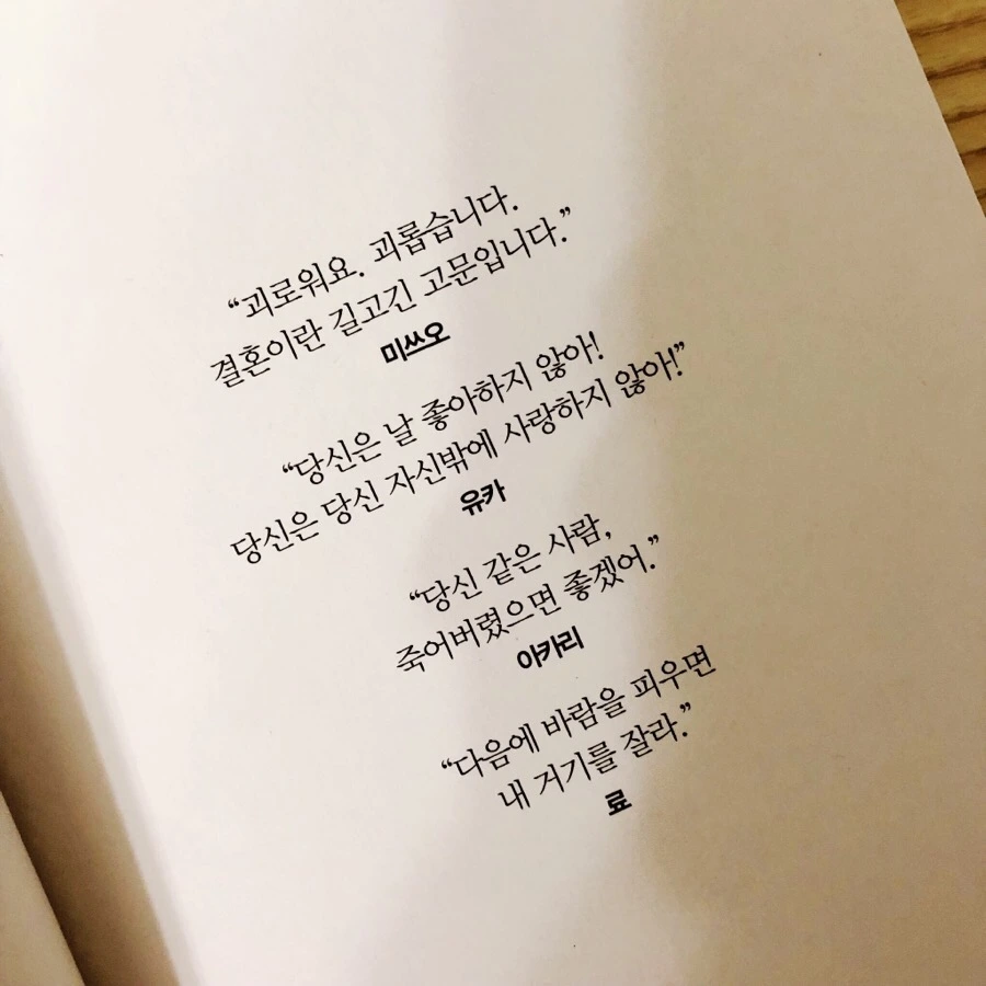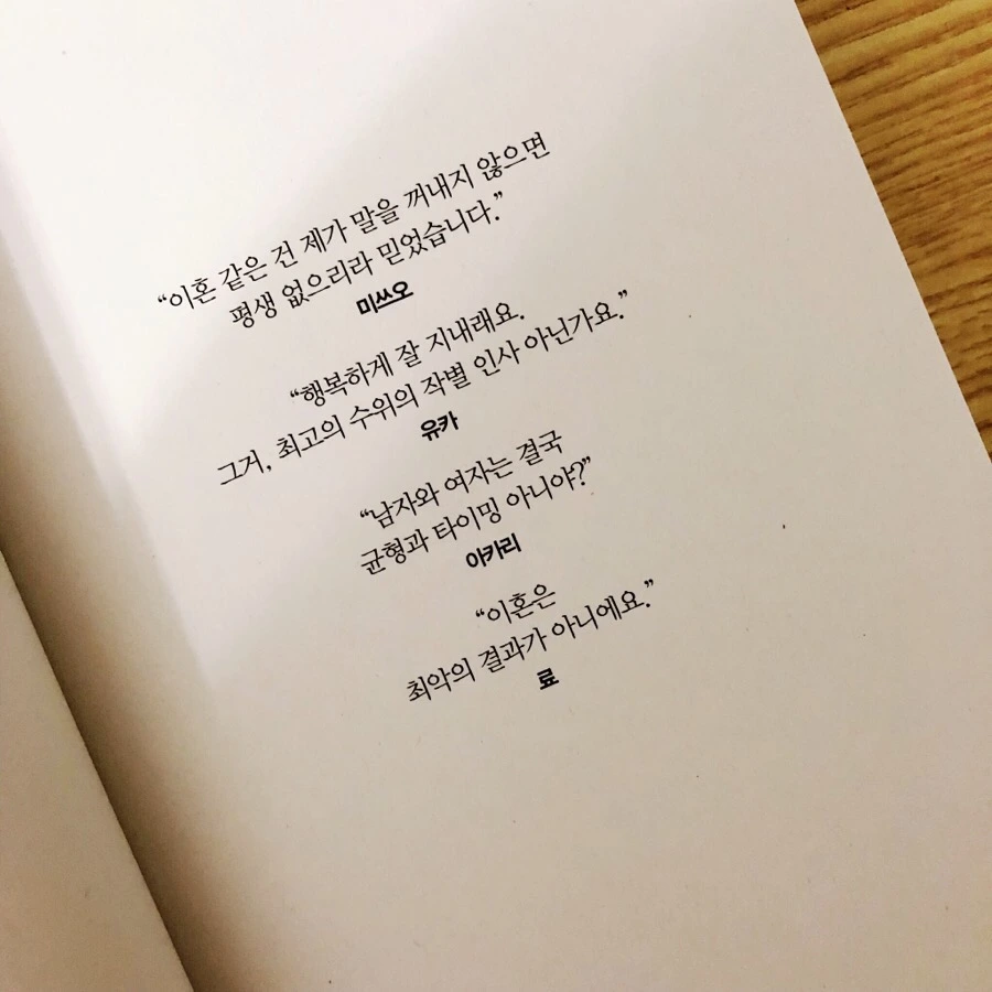 책 속에서 유카가 했던 말 중에 이혼은 부부뿐 아니라 가족의 이혼이라 다른 가족에게 죄송스럽다고 말하는 부분이 등장하는데요, 그렇지요. 결혼은 연인처럼 단순한 이별만으로 해결되지는 않습니다.