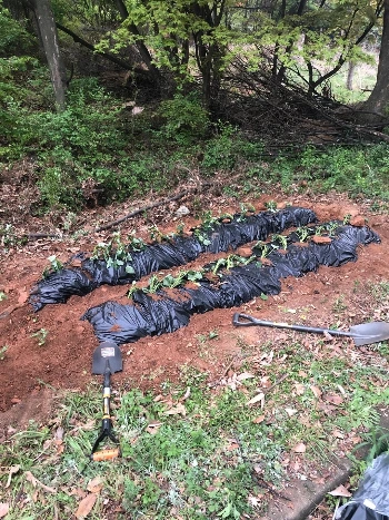 어느 정도 돌들이 제거되자 진도가 빨라졌다. 모종을 심을 수 있도록 형태를 만들고 비닐을 덮고 고구마와 수박 모종들을 심었다.