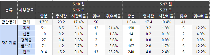 자, 이제 선택은 당신의 몫이다. 나는 2018년까지 시간낭비 60%, 노력 40%, 몰입 0%의 삶을 살았다. 하지만 지금은 정반대의 삶을 살고 있다. 몰입의 비율을 더 높이기 위해 부단히 노력하고 있다. 아래 사진은 내가 몰입하는 시간을 늘리기 위한 시간관리 시스템이다. 지난주, 지난달을 비교하면서 시간을 관리하고 있다. 마치, 가능성 있는 회사에 투자하듯 나에게 주어진 24시간을 의미 있게 보내려고 노력한다. 지금은 비록 작은 성취들을 경험하고 있지만, 3년, 5년, 10년 후 내 인생은 점점 더 성장할 것으로 확신한다.