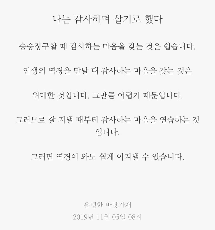2013년부터 2017년까지 5년 간은 내 인생의 암흑기였다. 영감, 아이디어, 성취, 만족감은 없었고, 지루함 회의감, 실망, 재미없음과 같은 것들이 나를 지배했다. 새로운 생각을 떠올리고 생산적인 몰입을 하고 싶었지만, 생각처럼 쉽지 않았다. 힘든 난관을 뚫기 위해 선택한 게 대학원 진학이었다. 그나마 대학원에 가서 좋은 스승님과 동기분들을 만나 늪에서 빠져나오게 되었다. 긍정심리의 중요성에 대해 인식하게 되었으며, 자기 암시를 통해 긍정심리를 강화하기 위한 훈련을 하다 보니 잠자고 있었던 영감과 아이디어들이 깨어남을 느끼고 있다. 브런치에 쓸 글감이 쉽게 떠오르고 글을 쓰다가도 영감이 떠오른다. 아이들을 지도할 때도 작년과 확연히 다르게 지도하고 있음을 느낀다. 주말이 되면 다음 주 조회시간에 얘기할 훈화를 생각하는데 기가 막힌 생각들이 일요일 저녁마다 떠오른다.