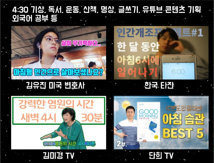 최근에 본 <김유진 미국 변호사> 채널에서는 일이 잘 안 풀리고 앞이 잘 안 보일 때 습관을 돌아보고 4시 30분에 일어나서 자기 계발을 한다는 영상을 보았다. 영상에 비친 그분은 생기가 넘치고 행복해 보였다. 해당 영상을 보고 댓글을 남긴 사람들도 긍정적인 영향을 받게 되어 감사하다는 글이 넘쳐났다. 순간 나도 4시 30분에 일어나 봐?라고 생각했지만, 현실적이지 못했다. 그래서 난 기존 6시에서 30분을 당겨 5시 30분에 일어나 보기로 했다. 자기 계발을 위한 시간을 더 확보하고 싶었기 때문이다.