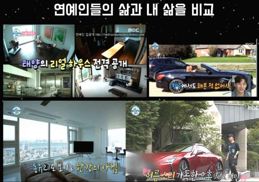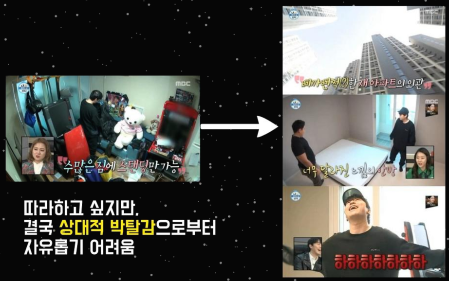 관찰 예능을 보면 재미가 있고 스트레스가 풀린다. 그런데 보다 보면 나도 모르게 상대적 박탈감의 씨앗이 마음에 뿌려지고 슬금슬금 줄기가 자라 마음의 잡초들이 무성해진다. 연예인들이 사는 집, 가구, 자동차 등 그들이 소유하고 있는 것을 내 것과 비교했다. 물론, 일부 연예인들의 경우 연예인 같지 않은 검소하고 평범한 삶을 보여준 적도 있었다. 하지만, 시간이 흘러 그들은 어느덧 큰 인기와 부를 얻어 다른 연예인들과 비슷한 라이프 생활로 변해갔다. 그래서 재미는 있었지만, 상대적 박탈감은 점점 커져만 갔다. 그들의 삶을 따라 하고 싶지만, 따라 할 수 없는 현실에 좌절했고 그저 부러울 따름이었다.