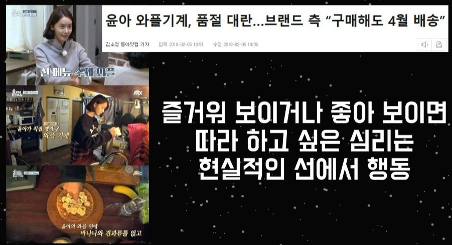 ‘효리네 민박’ 프로그램에서 윤아 씨가 와플 기계를 가져와서 와플 만드는 장면이 전파를 탔다. 해당 와플은 품절 대란을 일으켰다. 그런 현상을 보면서 좋아 보이는 것을 따라 하는 심리는 모두가 가지고 있는 본능이라고 생각하게 되었다.